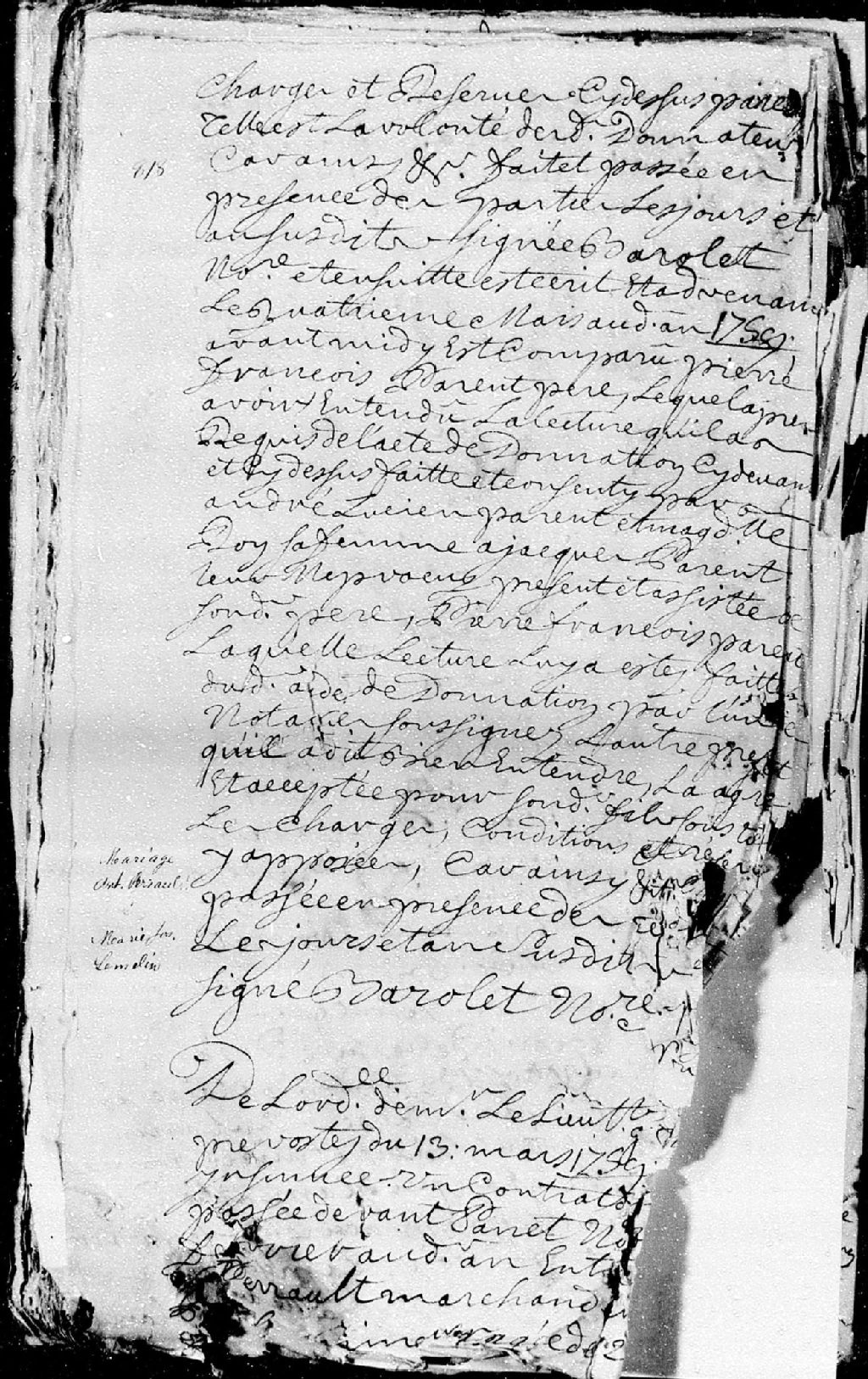 Extrait du contrat de mariage passé pardevant maître Panet, notaire, entre Antoine Perrault, âgé de 22 ans, marchand de la ville de Québec, fils mineur de feu Bernard Perrault et de Marguerite Lamy (Talon), ses père et mère; et Marie-Josèphe Lemelin, âgée de 21 ans, fille mineure de Laurent Lemelin, navigateur absent de cette colonie depuis deux ans, et de Marie-Josèphe Doyon, ses père et mère, 11 février 1759 [Document insinué le 13 mars 1759], Archives nationales à Québec, Fonds Cour supérieure. District judiciaire de Québec. Insinuations, (03Q,CR301,P4510).