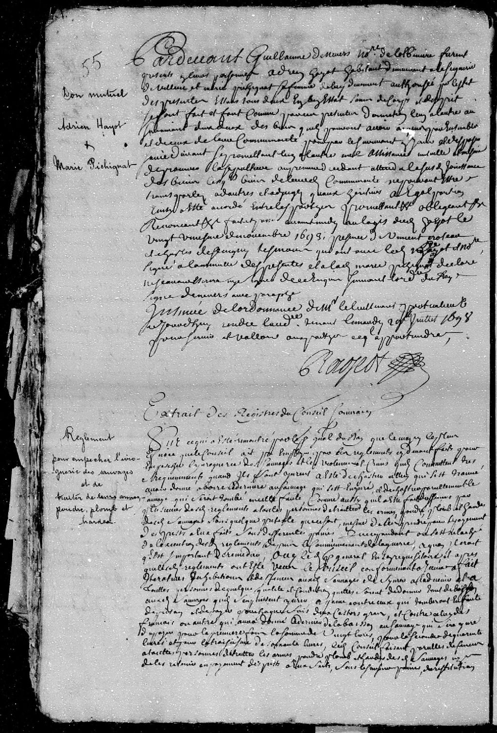 Règlement concernant la traite avec les sauvages (Amérindiens), et qui fait défense de traiter avec eux les hardes, armes et munitions, et de leur donner ou vendre de la boisson, afin d'empêcher l'ivrognerie chez les sauvages et de diminuer les violences et les crimes, 12 janvier 1699 [Document insinué le 20 janvier 1699], Archives nationales à Québec, Fonds Cour supérieure. District judiciaire de Québec. Insinuations, (03Q,CR301,P455).