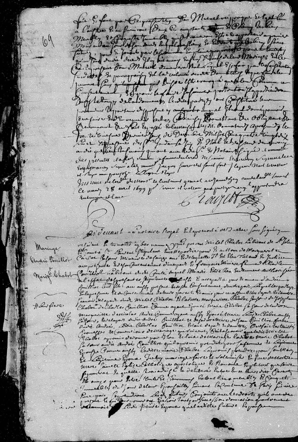 - La pièce se compose d'un contrat de mariage passé par-devant maître Rageot, notaire royal en la Prévôté de Québec, entre André Pouliot, fils de Charles Pouliot et Françoise Meunier, habitants de l'île et comté de Saint-Laurent; et Marguerite Chabot, mineure de 16 ans, stipulant par son frère et tuteur, Michel Chabot, habitant dudit comté de Saint-Laurent; en présence de Joseph Chabot; Charles Pouliot, comme ayant épousé Marie Chabot; Nicolas Audet, comme ayant épousé Marie-Louise Chabot; Jean Pouliot; Charles Pouliot; tous parents et amis des futurs époux; sont également présents maître Lepailleur (Lepallieur), huissier en la Prévôté de Québec, et Louis Gosselin, témoins