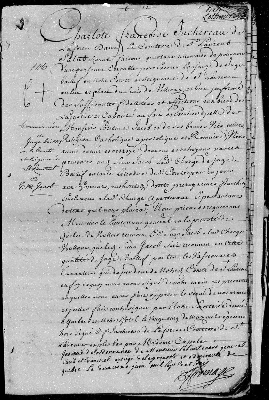 Commission de juge bailli dans le comté et seigneurie de Saint-Laurent accordée à Étienne Jacob, en remplacement du sieur de Villeray, suivant sa nomination par Charlotte-Françoise Juchereau de Laforest, dame et comtesse de Saint-Laurent