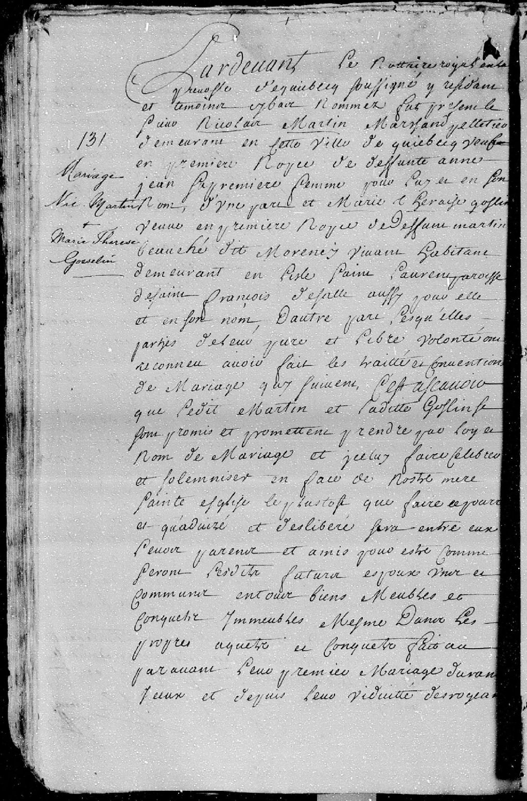 - Contrat de mariage passé pardevant maître Chambalon, notaire royal en la Prévôté de Québec, entre Nicolas Martin, marchand pelletier demeurant à Québec, veuf en premières noces de feue Anne Jean; et Marie-Thérèse Gaulin, veuve en premières noces de défunt Martin Baucher dit Morency, vivant habitant demeurant à l'île d'Orléans, paroisse de Saint-François-de-Sales; en présence de Claude Pauperet et Pierre-François Fromage, marchands, témoins