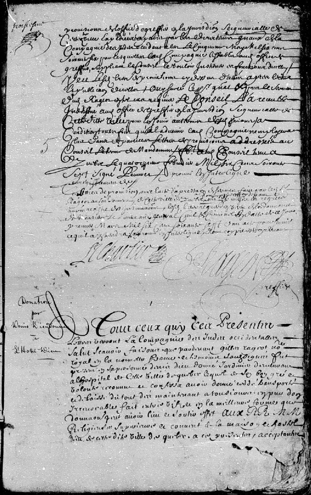 - Le titre complet de la pièce se lit comme suit : Donation par Denis Dieudonné, jardinier demeurant à l'hôpital de la ville de Québec, aux Révérendes Mères Religieuses supérieures du couvent de la maison de l'Hôtel-Dieu de Québec, Marie de Saint-Bonaventure de Jésus (Bonaventure), supérieure des Hospitalières de la Miséricorde de Jésus, stipulante pour elles, Jeanne-Agnès de Saint-Paul, religieuse assistante, et Marie-Renée de la Nativité, religieuse dépositaire de l'administration du bien et revenu de l'Hôtel-Dieu, de 10 arpents de terre sis près dudit Hôtel-Dieu, description de ladite terre et noms de voisins, lequel terrain fut acquis de Louis Couillard, sieur de l'Espinay et de Geneviève Després, sa femme, par contrat passé devant le notaire Becquet le 25 septembre 1666, Charles Amador Martin et Jacques Lamétairie, témoins demeurant à Québec