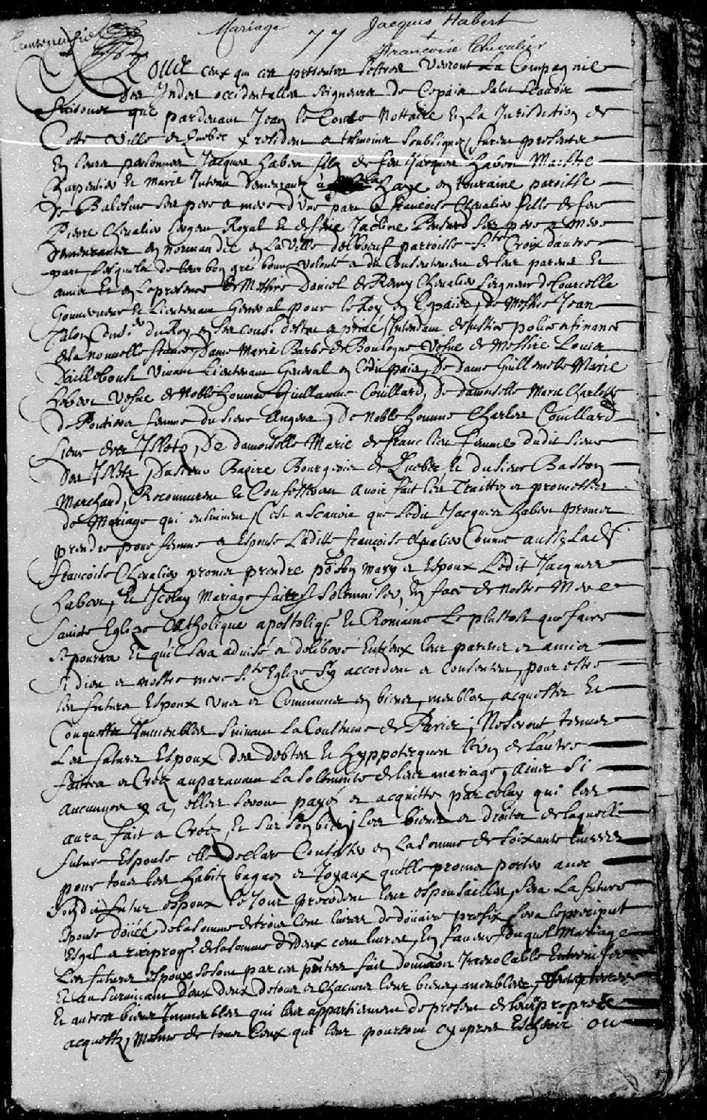 - La pièce se compose d'un acte de mariage entre Jacques Habert, fils du feu Jacques Habert, de son vivant maître charpentier, et de Marie Jutrau (Jutteau - Jatrau), ses père et mère demeurant à La Haye en Touraine en la paroisse de Balesme, et Françoise Chevalier, fille du feu Pierre Chevalier et de Jacqueline Ponsard, ses père et mère demeurant en Normandie en la ville d'Elbeuf en la paroisse de Sainte-Croix, sont présent messire Daniel de Rémy, chevalier, seigneur de Courcelle, gouverneur et lieutenant général pour Sa Majesté en Nouvelle-France, messire Jean Talon, conseiller du Roi en ses Conseils d'état et privé, intendant au Canada, Terre-Neuve et Acadie, dame Marie-Barbe de Boulogne, veuve du feu Louis D'Ailleboust (Dailleboust), de son vivant chevalier, seigneur de Coulonge et d'Argentenay, gouverneur en Nouvelle-France, dame Guillemette-Marie Hébert, veuve du feu sieur Guillaume Couillard, demoiselle Marie-Charlotte de Poitier, [...]