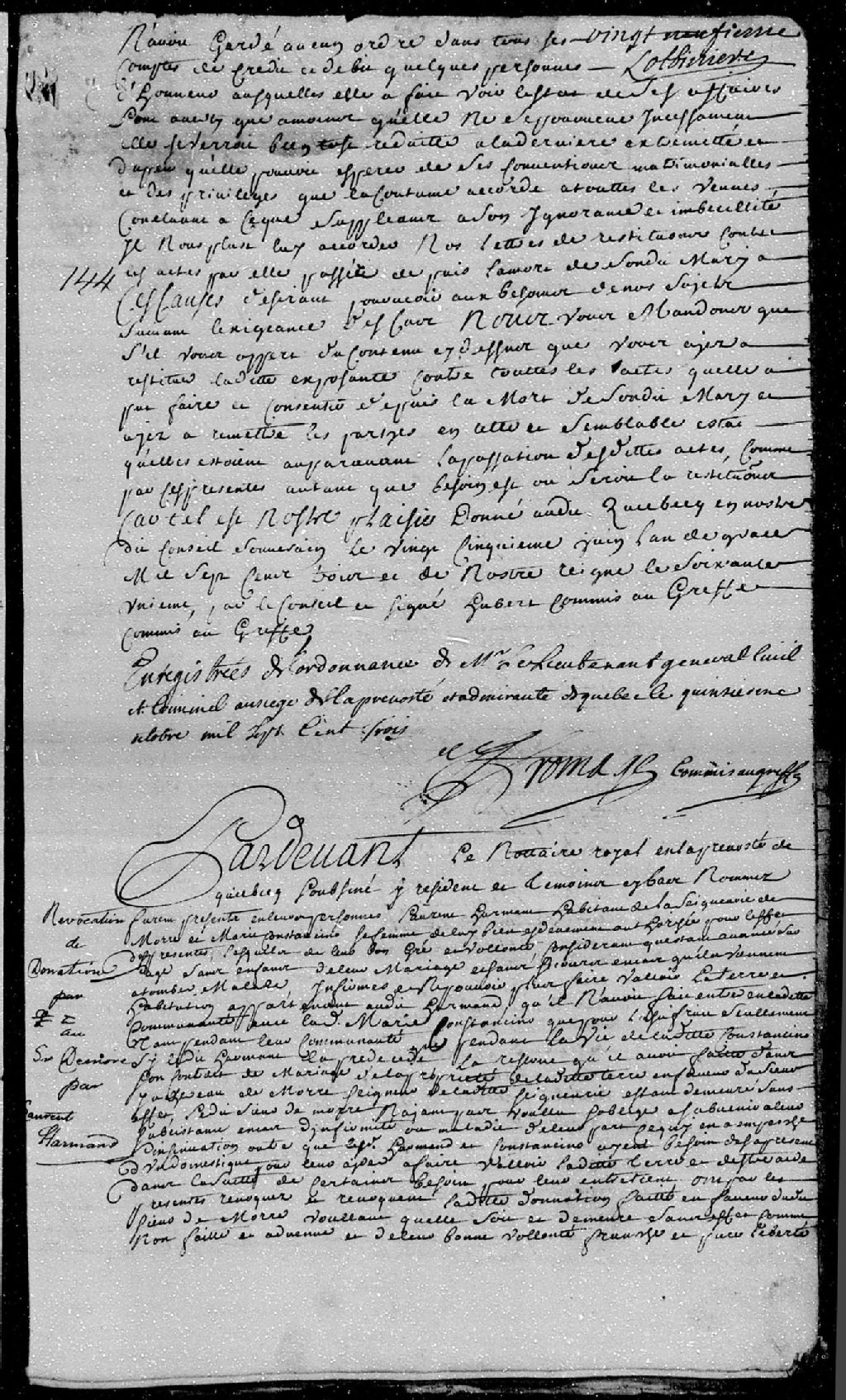 - Le titre complet de la pièce se lit comme suit : Révocation d'une donation de terre et habitation faite par Laurent Harmand (Armand), habitant de la seigneurie de Maur, et Marie Constantineau, sa femme, en faveur du sieur Juchereau, seigneur de Maur; lesdits Armand et Constantineau font ensuite donation de la terre et habitation en question au sieur François-Madeleine Ruette, écuyer et seigneur d'Auteuil, conseiller du roi et son procureur général au Conseil souverain de Québec, et à Marie-Anne Juchereau, son épouse; ledit acte est passé par-devant maître de Lacetière, notaire royal en la Prévôté de Québec, en présence de Jean Gobin et Pierre Normandin, marchands, témoins
