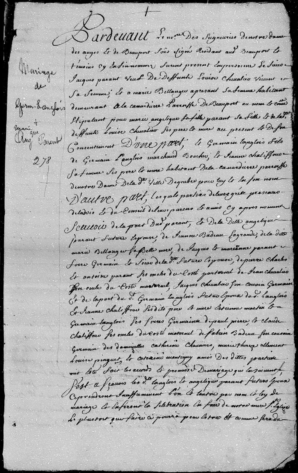 Contrat de mariage passé pardevant Duprac, notaire des seigneuries de Notre-Dame-des-Anges et de Beauport, entre Germain Langlois, fils de Germain Langlois, marchand boucher, et de Jeanne Chalifou, habitant de la Canardière, paroisse Notre-Dame de Québec; et Marie-Angélique Parent, fille de défunte Louise Chevalier et de Jacques Parent, à présent époux de Marie Bélanger, habitant demeurant à la Canardière, paroisse de Beauport