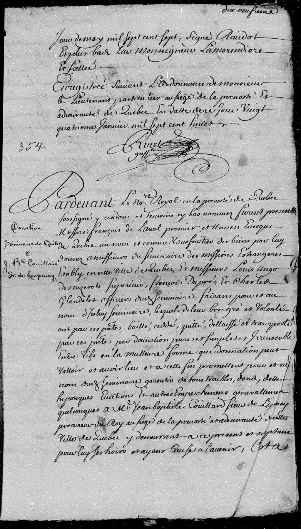 - Donation de tous les terrains et emplacements appartenant au Séminaire de Québec, situés en la Haute-Ville de Québec, par François de Laval, premier et ancien évêque de Québec, au nom et comme usufruitier des biens par lui donnés au Séminaire de Québec; à Jean-Baptiste Couillard, sieur de L'Espinay, procureur du roi au siège de la Prévôté et Amirauté de Québec...