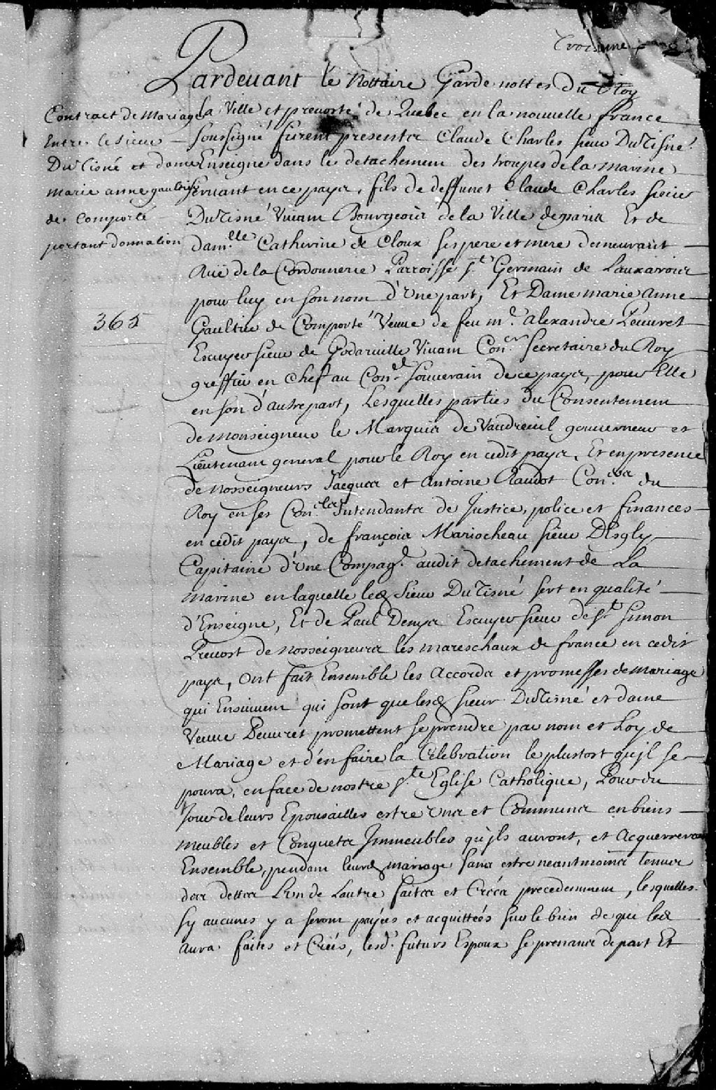 - La pièce se compose d'un contrat de mariage passé par-devant maître Genaple, notaire garde-notes du roi en la ville et Prévôté de Québec, entre Claude-Charles Dutisné, enseigne dans le détachement des troupes de la Marine, fils de défunt Claude-Charles, sieur Dutisné, vivant bourgeois de la ville de Paris, et de Catherine Duclou, ses père et mère, demeurant rue de la Cordonnerie, paroisse Saint-Germain de l'Auxerrois; et Marie-Anne Gauthier de Comporté, veuve de défunt Alexandre Peuvret, écuyer et sieur de Gaudarville (Godarville), vivant conseiller secrétaire du roi et greffier en chef au Conseil souverain de Québec