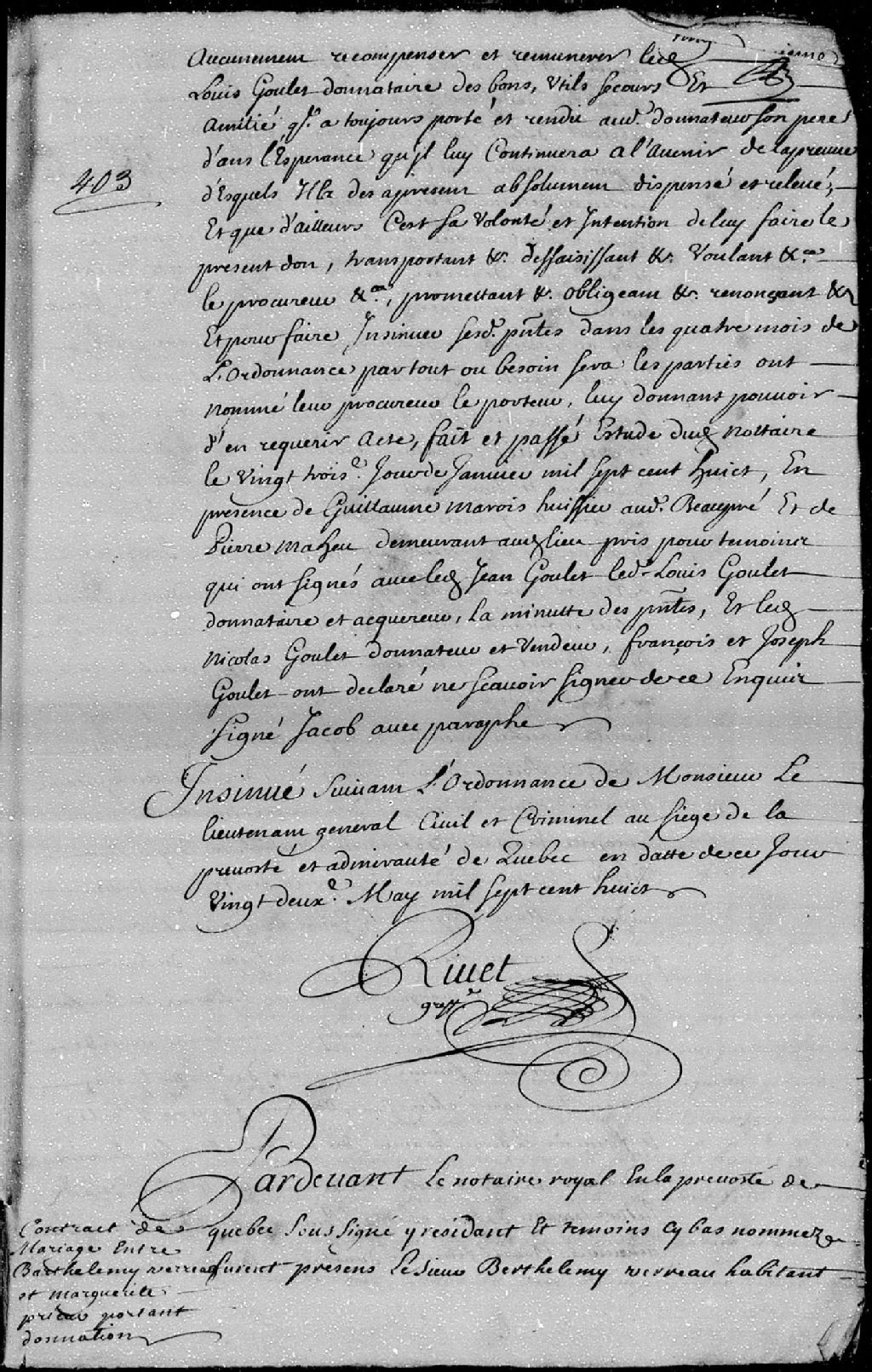 Contrat de mariage passé pardevant maître Chambalon, notaire royal en la Prévôté de Québec, entre Barthélemi Verreau, habitant demeurant en la côte de Beaupré, paroisse du Château-Richer, fils de défunt Barthélemi Verreau et de Marthe Quitel; et Marguerite Prieur, fille de défunt Joseph Prieur, vivant huissier audiancier au siège de la Prévôté et Amirauté de Québec, et d'Hélène Meschin (Méchin), 12 février 1708 [Document insinué le 19 juin 1708], Archives nationales à Québec, Fonds Cour supérieure. District judiciaire de Québec. Insinuations, (03Q,CR301,P592).