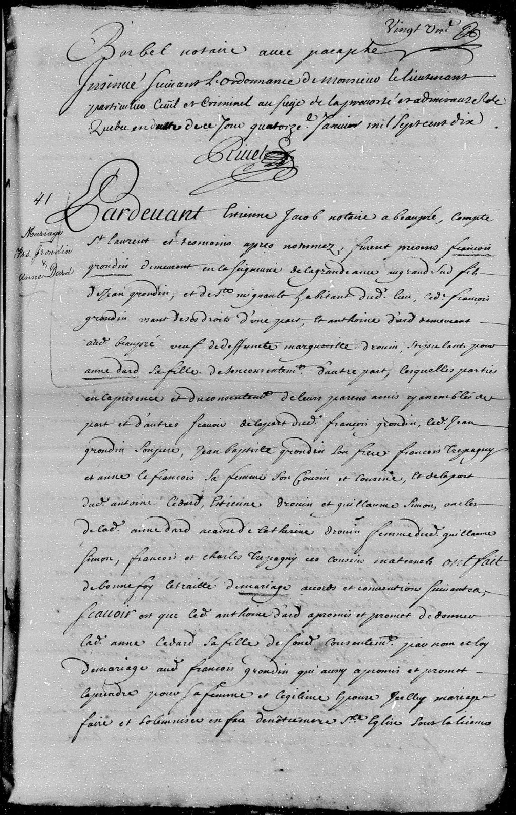 Contrat de mariage passé pardevant Étienne Jacob, notaire en la seigneurie de Beaupré, entre François Grondin, demeurant en la seigneurie de la Grande-Anse au grand Sud, fils de Jean Grondin et de Sainte Mignault, habitants dudit lieu de Beaupré; et Anne Dard (Darde), fille d'Antoine Dard, demeurant également en la seigneurie de Beaupré, et de défunte Marguerite Drouin