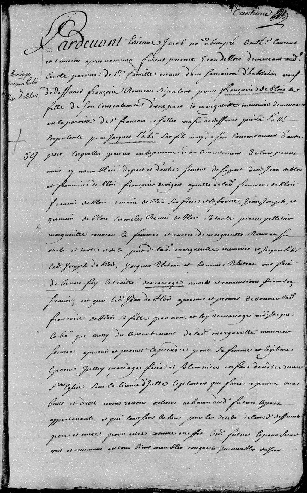 Contrat de mariage passé pardevant Étienne Jacob, notaire en la seigneurie de Beaupré et comté de Saint-Laurent (île d'Orléans), entre Jacques Labbé, fils de Marguerite Meunier, demeurant en la paroisse de Saint-François-de-Sales, et de défunt Pierre Labbé; et Françoise Deblois, fille de Jean Deblois, demeurant audit comté de Saint-Laurent, paroisse Sainte-Famille, et de défunte Françoise Rousseau
