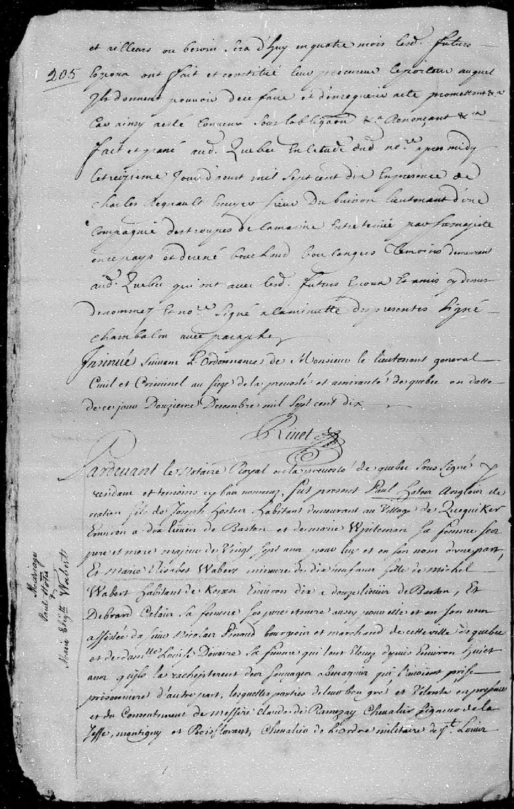- Contrat de mariage passé par-devant maître Chambalon, notaire royal en la Prévôté de Québec, entre Paul Hoteis (Hotesse), anglais de nation, majeur de 27 ans; et Marie-Élisabeth Wabert, mineure de 19 ans...
