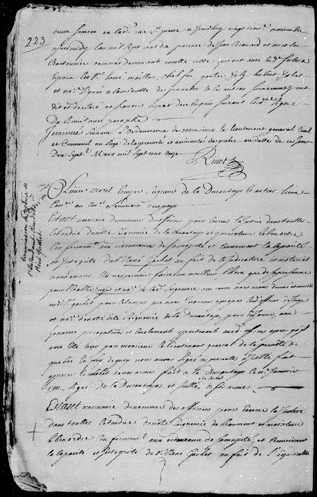 Ordonnance de l'intendant Jacques Raudot qui octroie à René Gachet (Gaschet) trois commissions de juge et notaire, soit celles des seigneuries de Beaumont, La Durantaye et Bellechasse, 11 janvier 1711 et 14 mars 1711 [Insinué le 18 mars 1711], Archives nationales à Québec, Fonds Cour supérieure. District judiciaire de Québec. Insinuations, (03Q,CR301,P674).