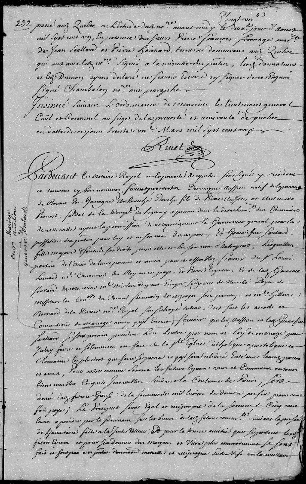 Contrat de mariage passé pardevant maître de Lacetière, notaire royal en la Prévôté de Québec, entre Dominique Aussion, natif de la paroisse de Barran, en Gascogne, archevêché d'Auch, fils de Pierre Aussion et d'Antoinette Dancosse, soldat de la compagnie de Lignery, à présent dans le détachement des canonniers de Québec; et Geneviève Soulard, fille majeure