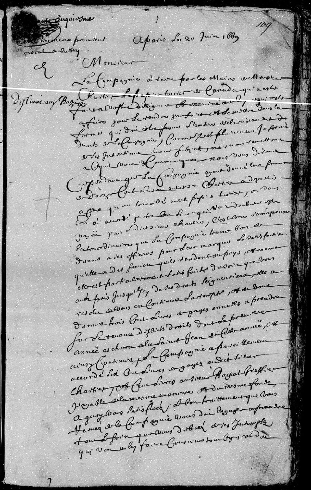 Lettre de la Compagnie de la Nouvelle-France, au sieur de Mesnu, au sujet du salaire des employés de la compagnie, 20 juin 1669 [Document insinué le 17 février 1671], Archives nationales à Québec, Fonds Cour supérieure. District judiciaire de Québec. Insinuations, (03Q,CR301,P68).