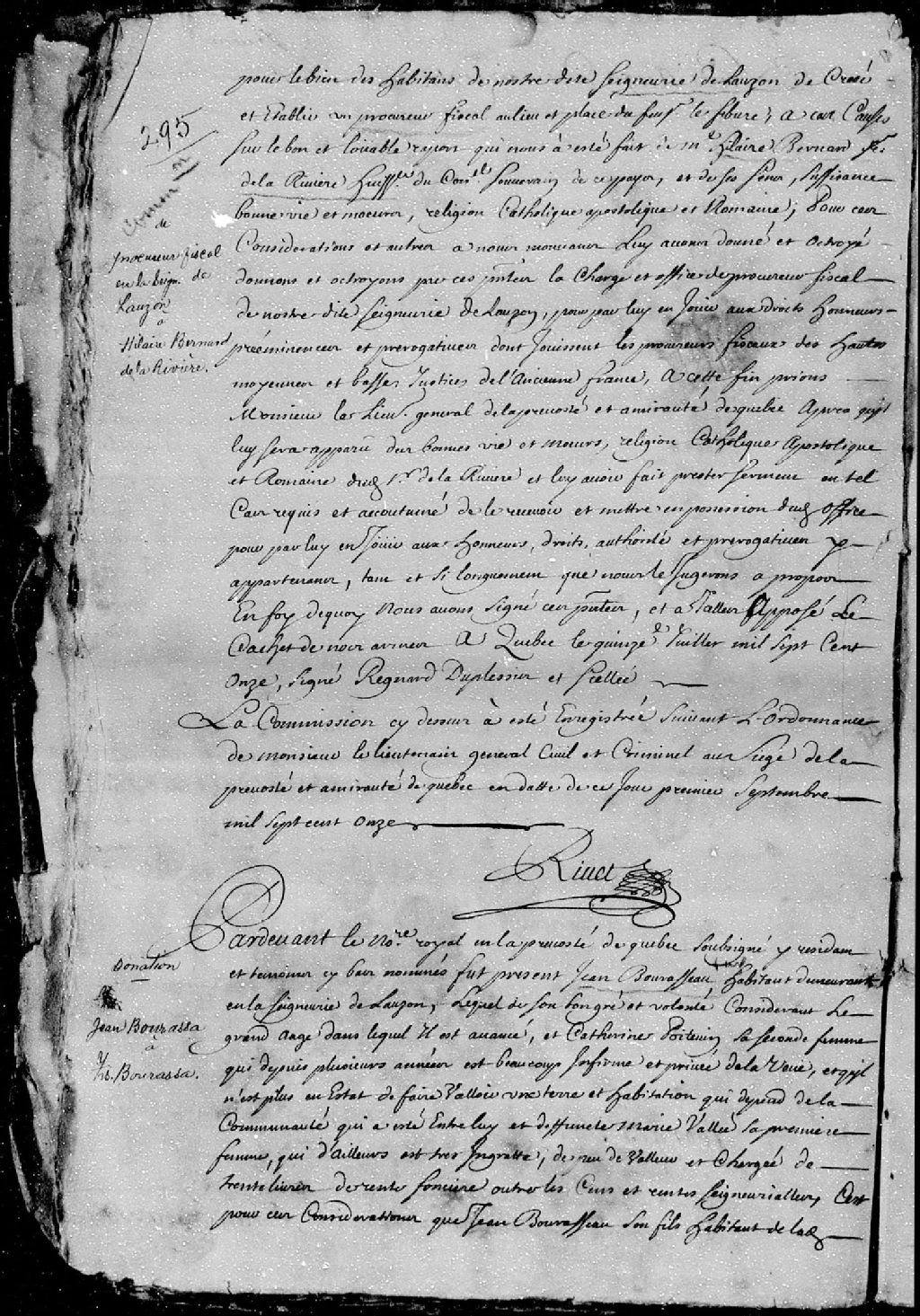 Donation d'une terre sise et située en la seigneurie de Lauzon, dépendante de la communauté qui a été entre Jean Bourassa et feue Marie Vallée (Perrette Vallée), par Jean Bourassa, habitant demeurant en la seigneurie de Lauzon, et Catherine Poitevin, sa seconde femme, laquelle est infirme et privée de la vue depuis quelques années; à François Bourassa, leur fils; ladite donation est passée pardevant maître Chambalon, notaire royal en la Prévôté de Québec