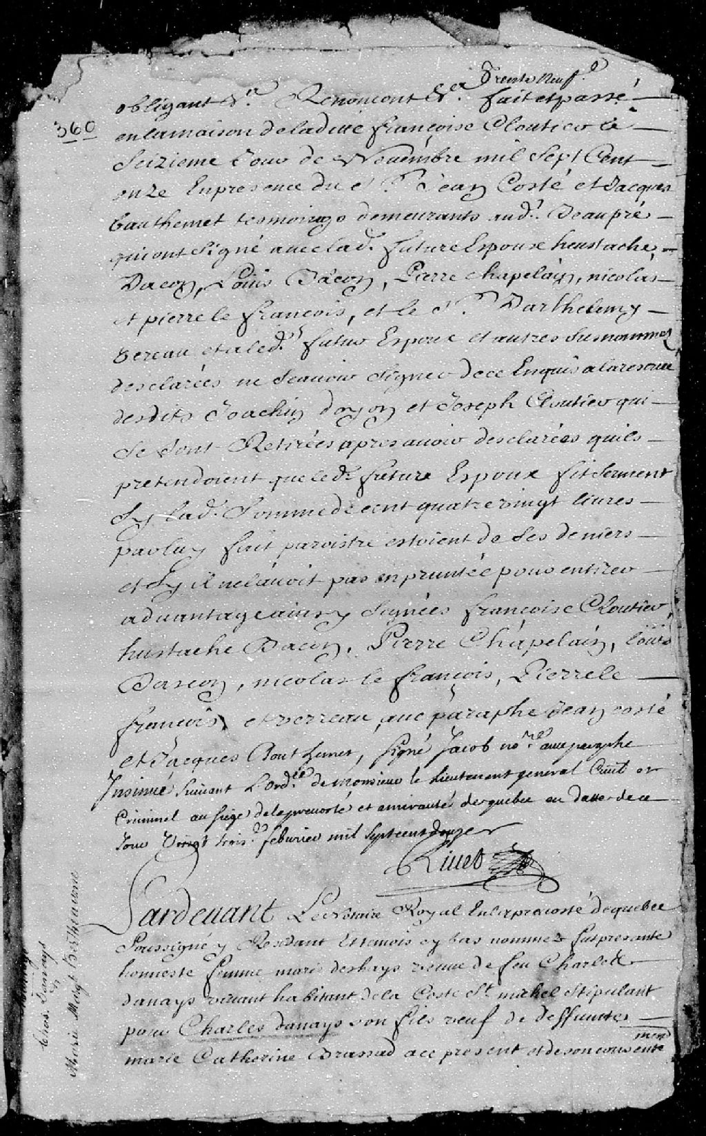Contrat de mariage passé pardevant maître de Lacetière, notaire royal en la Prévôté de Québec, entre Charles Danais (Danet), veuf de défunte Marie-Catherine Brassard, fils de Marie Deshayes et de feu Charles Danais (Danet), vivant habitant de la côte Saint-Michel; et Marie-Madeleine Berthiaume, fille majeure