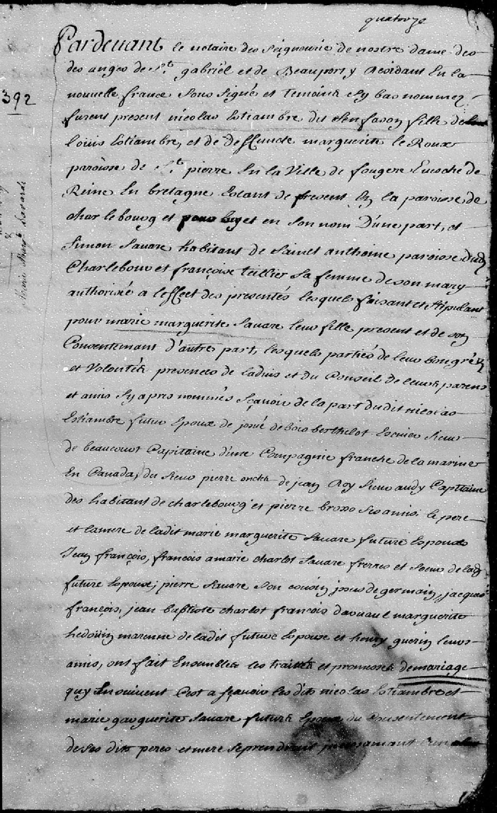 - La pièce se compose d'un contrat de mariage passé par-devant maître Duprac, notaire des seigneuries de Notre-Dame-des-Anges, Saint-Gabriel et Beauport, entre Nicolas Estiambre dit Sansfaçon, fils de Louis Estiambre et de défunte Marguerite Leroux, demeurant en la paroisse de Saint-Pierre, en la ville de Fougères, évêché de Rennes en Bretagne, présentement en la paroisse de Charlesbourg; et Marie-Marguerite Savard, fille de Simon Savard, habitant de Saint-Antoine, paroisse dudit lieu de Charlesbourg, et de Françoise Tellier, ses père et mère