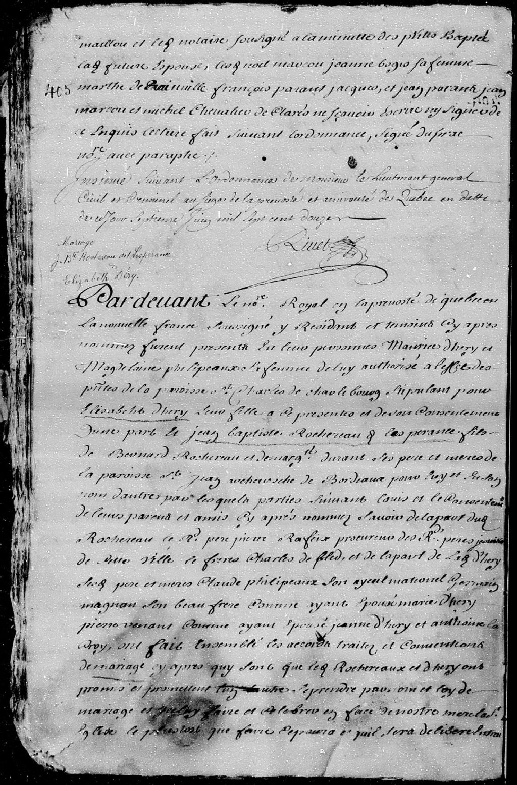Contrat de mariage passé pardevant maître Dubreuil, notaire royal en la Prévôté de Québec, entre Jean-Baptiste Rochereau dit Lespérance, fils de Bernard Rochereau et de Marguerite Durand, ses père et mère, de la paroisse Saint-Jean, archevêché de Bordeaux; et Élisabeth Déry, fille de Maurice Déry et de Madeleine Philippeau