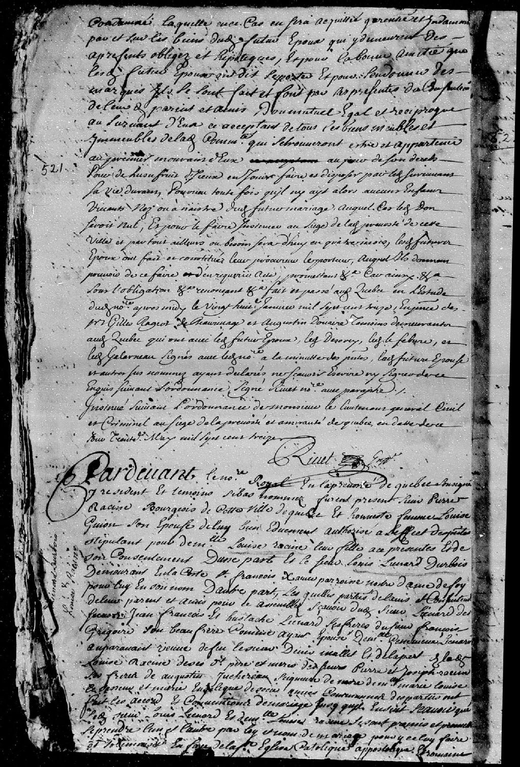 Contrat de mariage passé pardevant maître de Lacetière, notaire royal en la Prévôté de Québec, entre Louis Liénard dit Durbois, demeurant en la côte Saint-François-Xavier, paroisse Notre-Dame-de-Foy; et Louise Racine, fille de Pierre Racine, bourgeois de Québec, et de Louise Guion (Guyon), ses père et mère