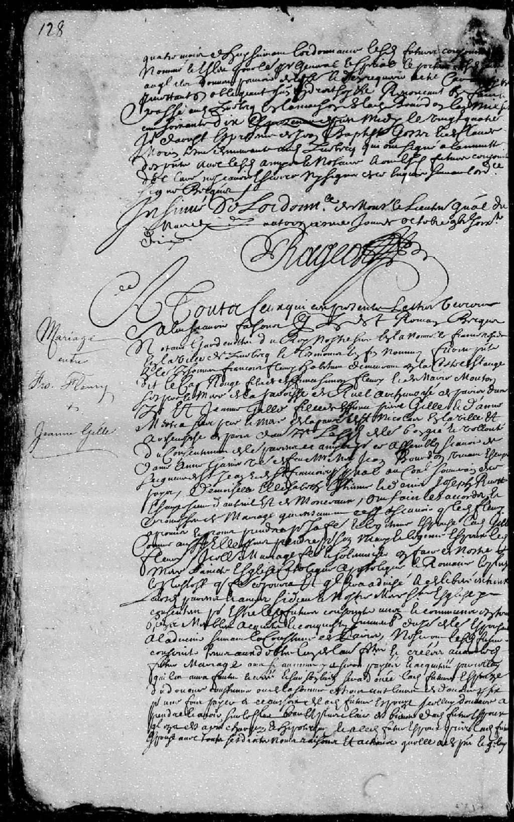 Le titre complet de la pièce se lit comme suit : Mariage entre François Fleury, habitant demeurant en la côte Saint-Ange dit le Cap-Rouge, fils du feu Simon Fleury et de Marie Mouton (Moutton), ses père et mère de la paroisse de Rueil en l'archevêché de Paris, et Jeanne Gille (Gilles), fille du feu Pierre Gille (Gilles) et de Anne Nicola, ses père et mère de la paroisse de Saint-Nicolas en la ville et archevêché de Paris, sont présent dame Anne Gasnier (Gagné - Gagnier), veuve du feu sieur Jean Bourdon, de son vivant écuyer et seigneur de Saint-Jean et de Saint-François, conseiller au Conseil souverain, demoiselle Élizabeth Étienne, et Denis-Joseph Ruette, écuyer, sieur d'Auteuil et de Monceaux, amis des futurs époux, Jean-Baptiste Gosset et Claude Morin, sont témoins