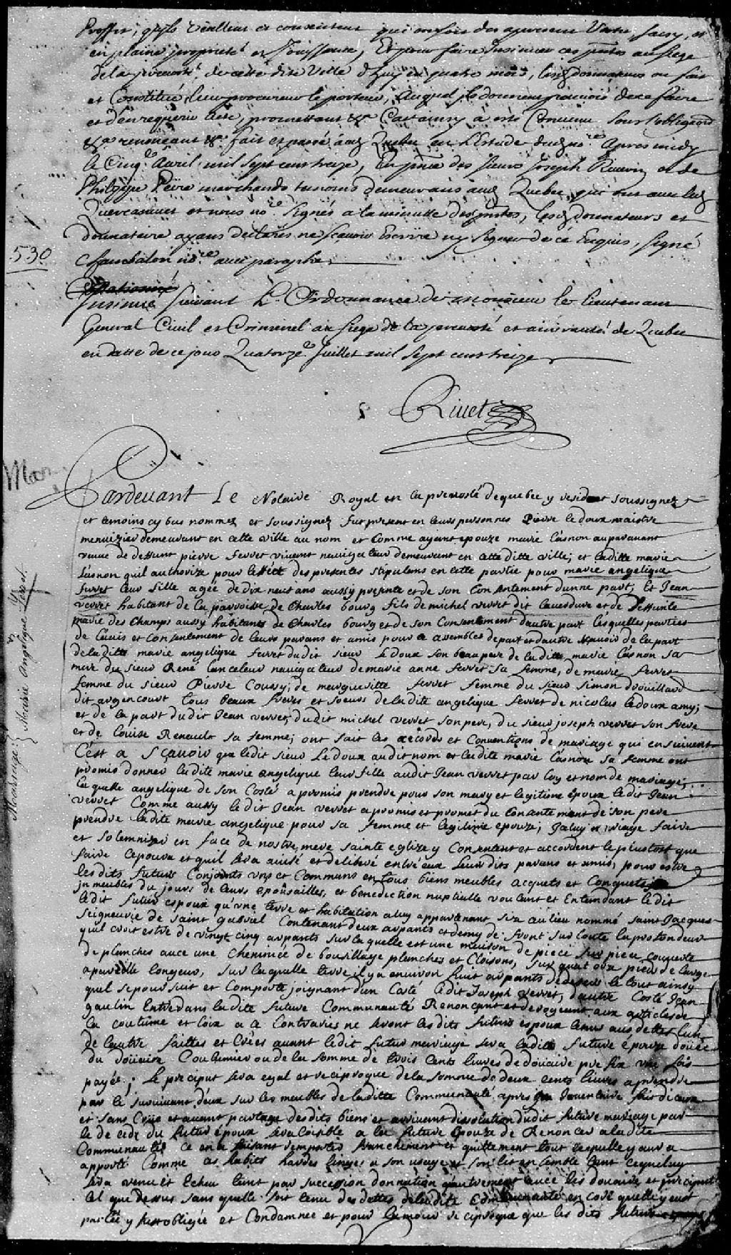 Le titre complet de la pièce se lit comme suit : Contrat de mariage passé par-devant maître Lepallieur (Lepailleur), notaire royal en la Prévôté de Québec, entre Jean Verret, habitant de la paroisse de Charlesbourg, fils de Michel Verret dit Laverdure et de défunte Marie Deschamps, ses père et mère, aussi habitants de Charlesbourg; et Marie-Angélique Ferret (Ferré), âgée de 19 ans, fille de défunt Pierre Ferret, vivant navigateur demeurant à Québec, et de Marie Lasnon, épouse en secondes noces de Pierre Ledoux, maître menuisier demeurant à Québec