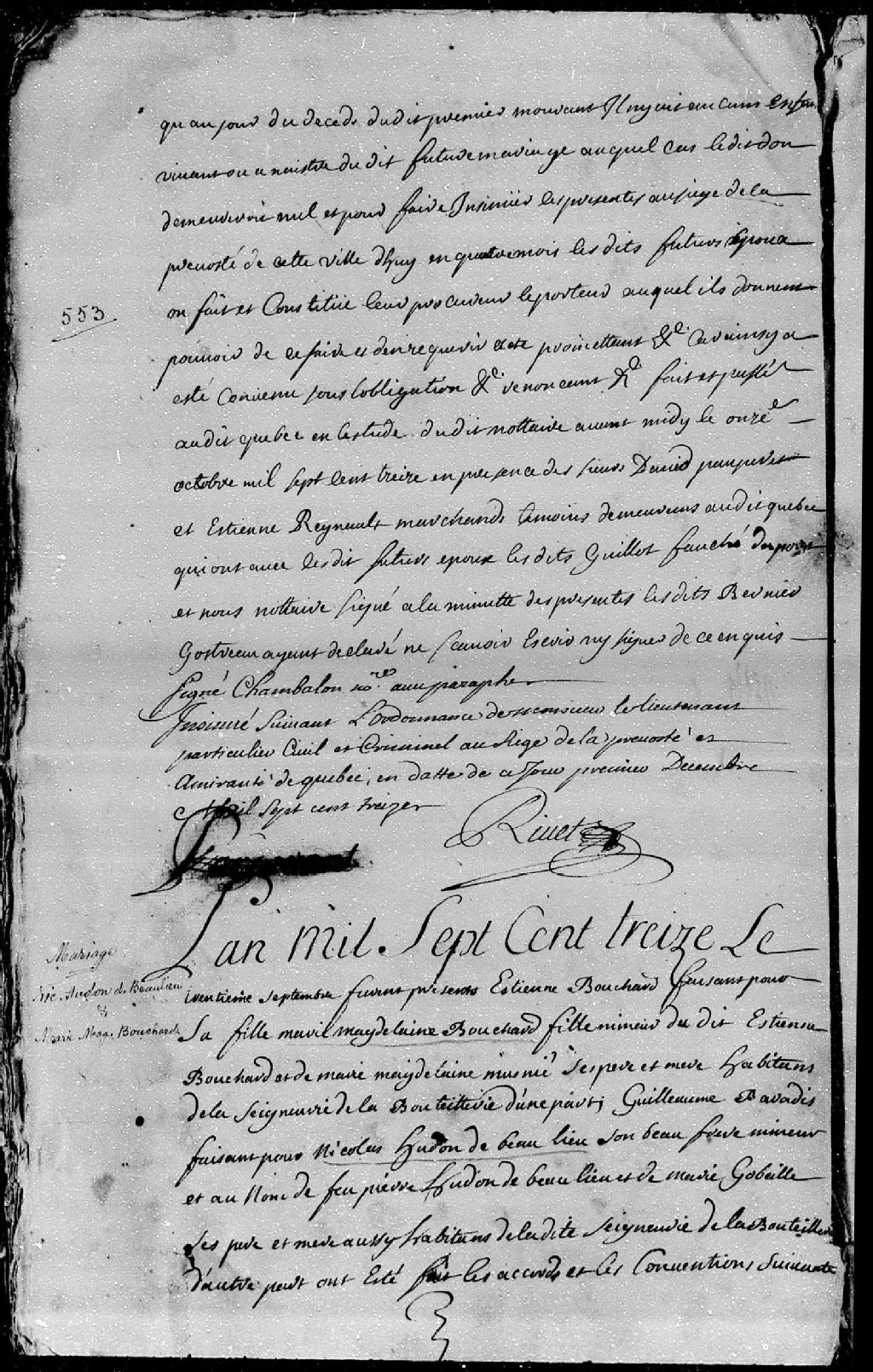 Contrat de mariage passé sous seing privé entre Nicolas Hudon dit Beaulieu; et Marie-Madeleine Bouchard..., 30 septembre et 16 octobre 1713 [Insinué le 1er décembre 1713], Archives nationales à Québec, Fonds Cour supérieure. District judiciaire de Québec. Insinuations, (03Q,CR301,P812).