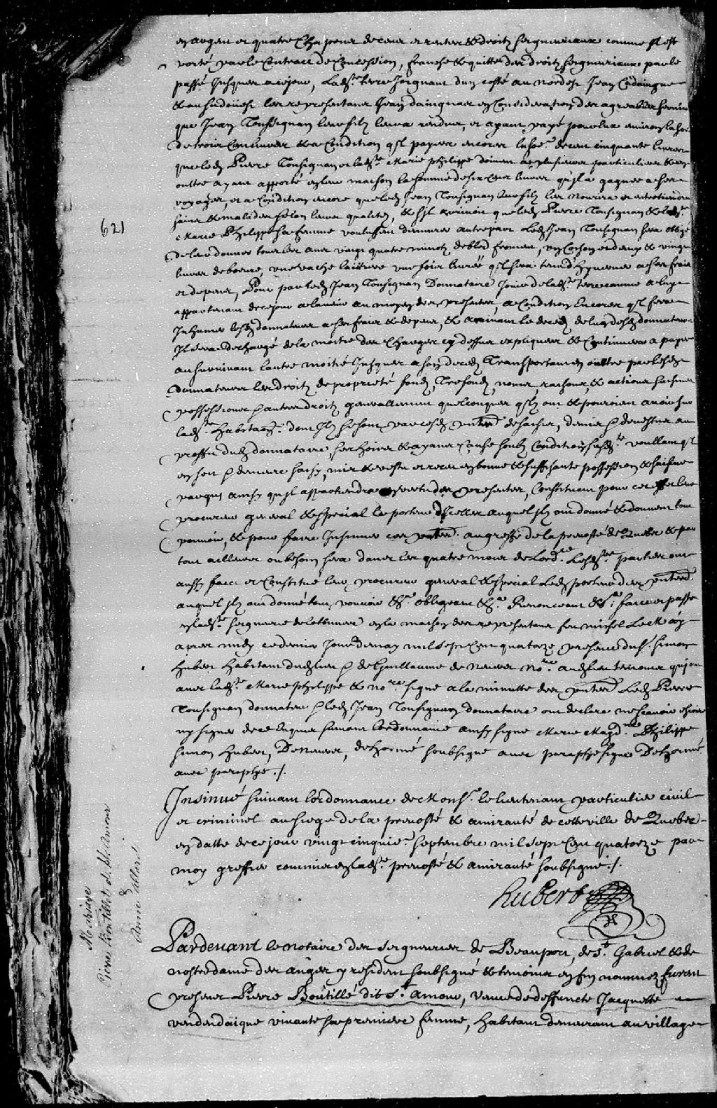 Contrat de mariage passé pardevant maître Duprac, notaire des seigneuries de Notre-Dame-des-Anges, Saint-Gabriel et Beauport, entre Pierre Boutillet dit Saint-Amour, veuf en premières noces de défunte Jacquette Vandandaigue, habitant demeurant au village de Saint-Pierre, paroisse de Charlesbourg; et Anne Allard, fille de François Allard, habitant demeurant au Bourg-Royal, en la susdite paroisse, et de défunte Jeanne Anguille, ses père et mère