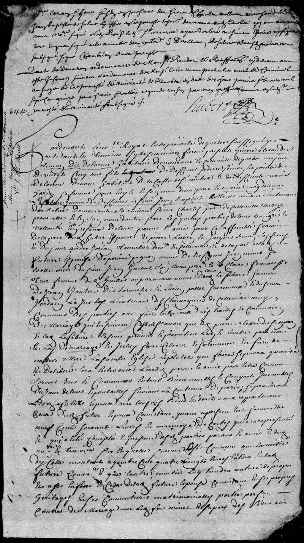Contrat de mariage passé parevant maître Chambalon, notaire royal en la Prévôté de Québec, entre Pierre-Alexandre Simon dit Delorme, habitantt demeurant en la ville de Québec, majeur de 25 ans, fils de défunt Pierre Simon Lapointe dit Delorme, vivant habitant de la côte Saint-Michel, et de défunte Marie Hardy (Anne-Jeanne Hardy); et Marie-Madeleine Lefebvre, veuve de défunt Jean-Baptiste Minet, vivant lieutenant de milice demeurant à la Rivière-Saint-Charles, paroisse de Québec