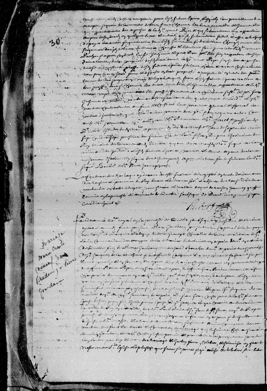 - Contrat de mariage passé par-devant maître Chambalon, notaire royal en la Prévôté de Québec, entre Pierre Jourdain, caporal de compagnie de monsieur le marquis Dalogny de la Grouaye (d'Aloigny de LaGroix), chevalier de l'Ordre militaire de Saint-Louis, commandant des troupes de la Marine en Nouvelle-France, demeurant en la ville de Québec; et Marie Creste (Crête)...