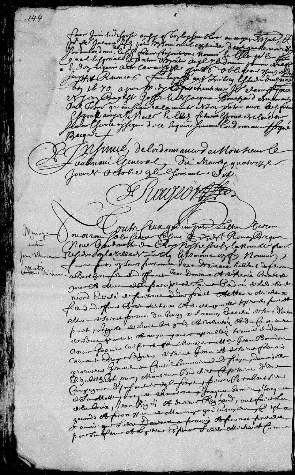 - Le titre complet de la pièce se lit comme suit : Mariage entre Jean Daveaux (Daniaux), habitant demeurant à Berthier, fils du feu Jean Darvaux (Daniaux) et de Renée Brunet, ses père et mère de la paroisse de Saint-André de Niort, en l'évêché de Poitou, et Marie Michau (Michaud), fille du feu Brésil Michau (Michaud) et de Marguerite Tessier, ses père et mère de Saint-Pierre du bourg de Sennevoy en l'évêché de Sens, sont présent dame Anne Gasnier (Gagné - Gagnier), veuve du feu sieur Jean Bourdon, de son vivant écuyer et seigneur de Saint-Jean et de Saint-François, conseiller au Conseil souverain, demoiselle Élizabeth Étienne, monsieur Bouthier (Bouteillerie), capitaine d'une compagnie d'infanterie en Nouvelle-France, Pierre Brabant, sieur de la Motte (Mothe - Lamotte), Jacques Chauveau, Jacques Bonnier, Jacques de la Croix (LaCroix), Jean Rigni, et le sieur Regnaud (Renaud), amis des futurs époux, Jean-Baptiste Gosset et Gilles Dutartre, demeurant à Québec, sont témoins