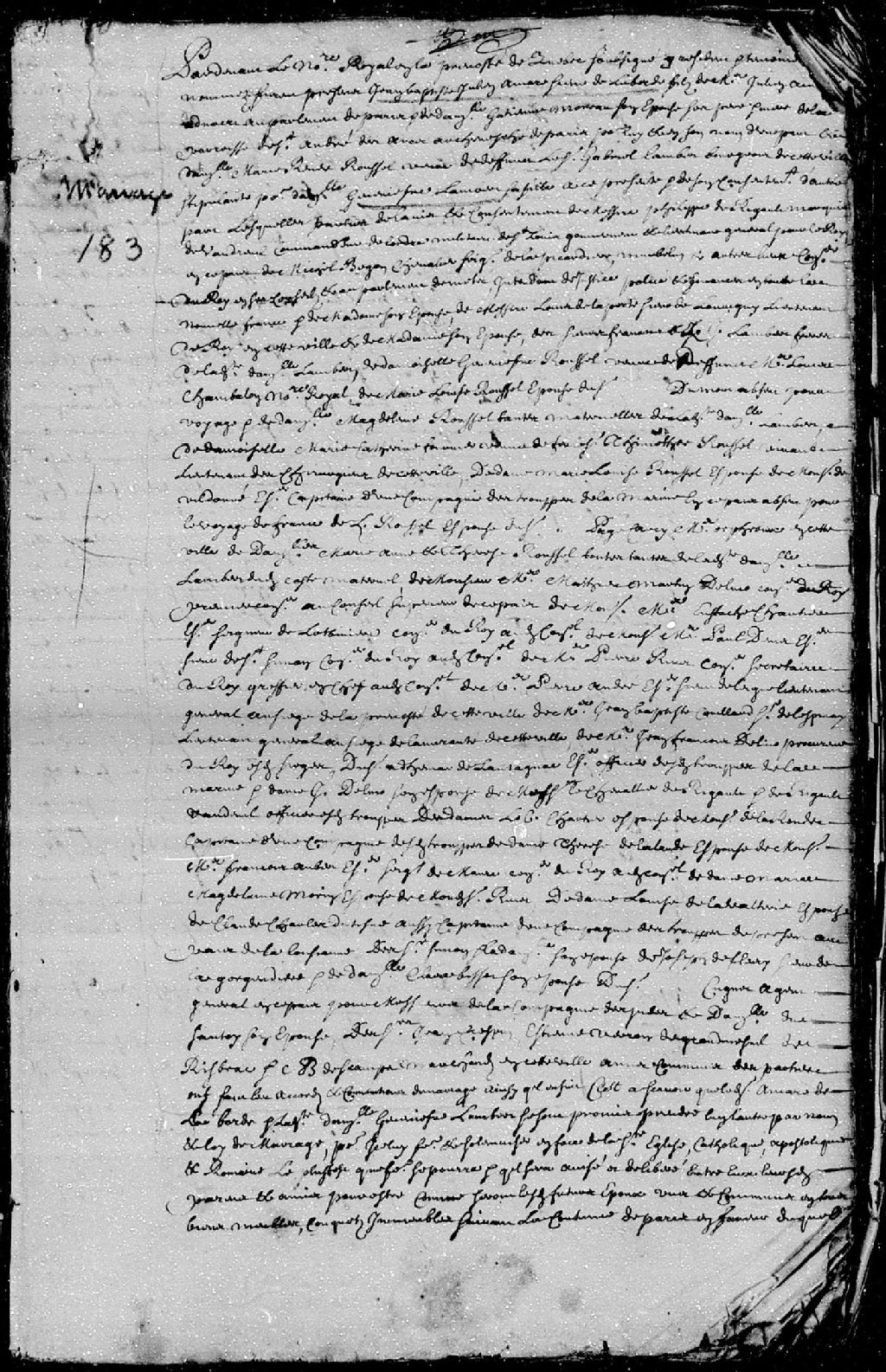 Contrat de mariage passé pardevant maître de LaCetière (La Cetière), notaire royal en la Prévôté de Québec, entre Jean-Baptiste-Julien Hamard (Amard), sieur de la Borde, fils de Julien Hamard, avocat au Parlement de Paris, et de (Sébastienne) Gatienne Moreau, ses père et mère, de la paroisse de Saint-André, archevêché de Paris; et Geneviève Lambert, fille de (Renée-Françoise) Marie-Renée Roussel et de feu Gabriel Lambert, vivant bourgeois de Québec