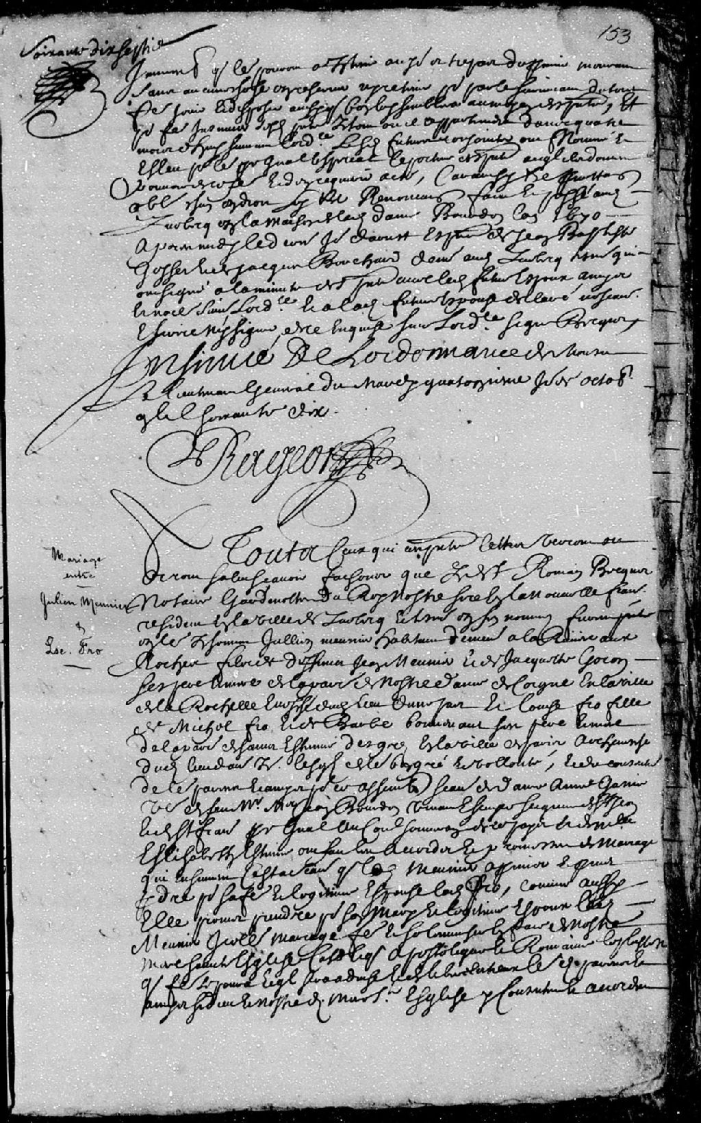 - Mariage entre Julien Meunier, habitant demeurant à la rivière aux rochers, fils du feu Jean Meunier et de Jacquette Goron (Gauron), ses père et mère de la paroisse de Notre-Dame de Coigne en la ville de LaRochelle, et Louise Fro...