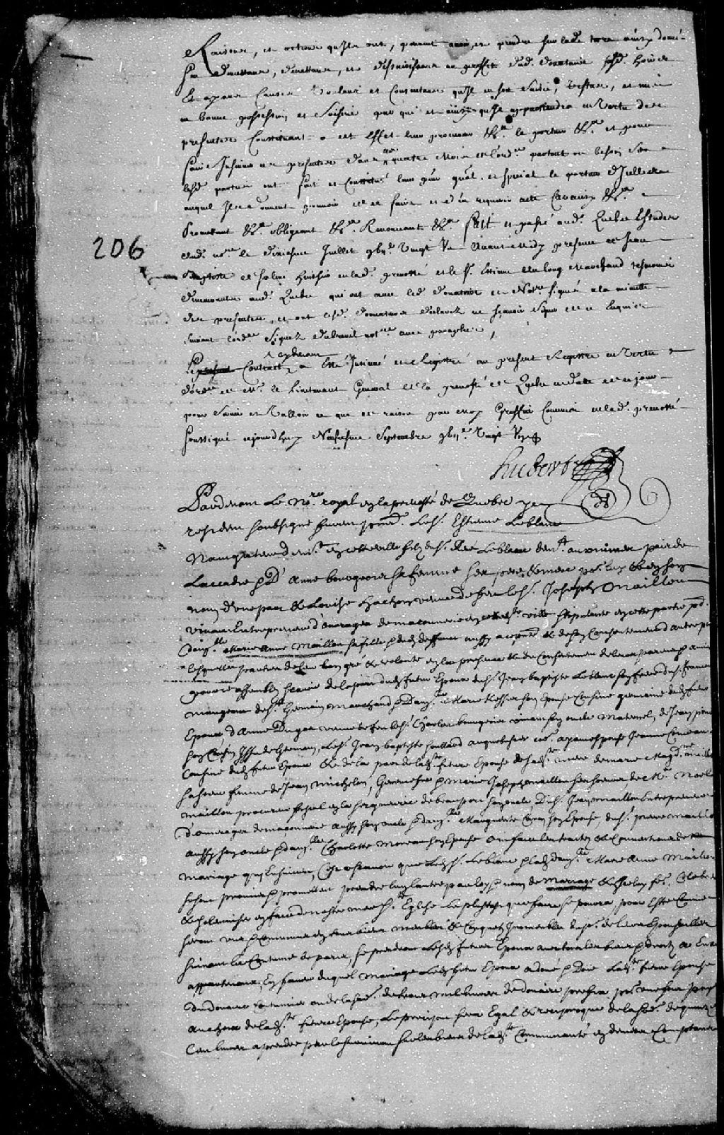 Contrat de mariage passé pardevant maître de LaCetière (La Cetière), notaire royal en la Prévôté de Québec, entre Étienne Leblanc, navigateur demeurant en la ville de Québec, fils de René Leblanc demeurant aux mines près de l'Acadie (Saint-Charles des Mines), et d'Anne Bourgeois, ses père et mère; et Marie-Anne Maillou (Mailloux), fille du défunt Joseph Maillou, vivant entrepreneur d'ouvrages de maçonnerie de Québec, et de Louise Achon
