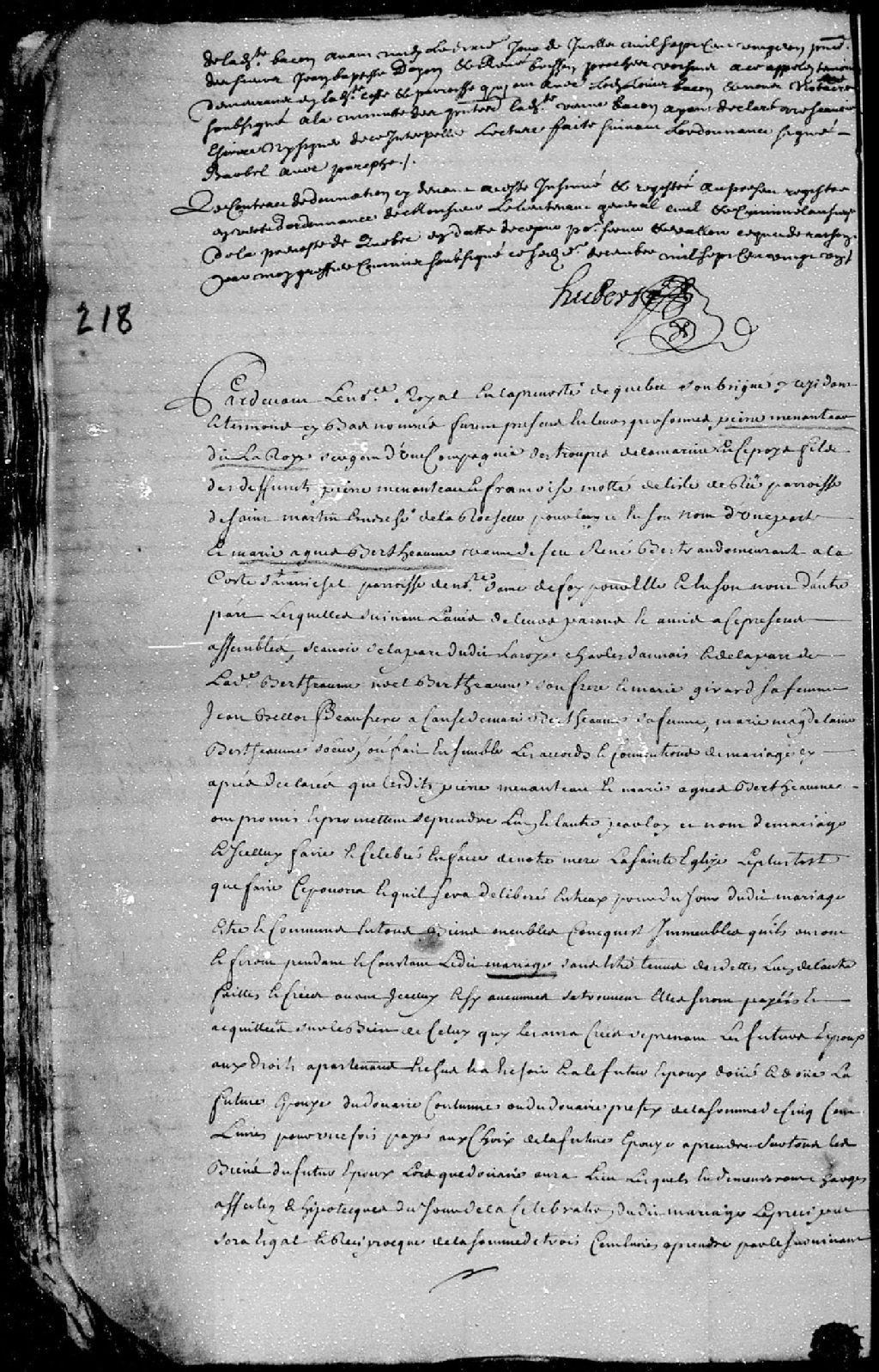 Contrat de mariage passé pardevant maître Dubreuil, notaire royal en la Prévôté de Québec, entre Pierre Menanteau dit Larose, sergent d'une compagnie des troupes de la Marine, fils des défunts Pierre Menanteau et Françoise Moré (Motté), de l'île de Ré, paroisse de Saint-Martin, évêché de La Rochelle; et Marie-Agnès Berthiaume, veuve de défunt René Bertault (Bertrand), demeurant en la côte Saint-Michel, paroisse Notre-Dame-de-Foy