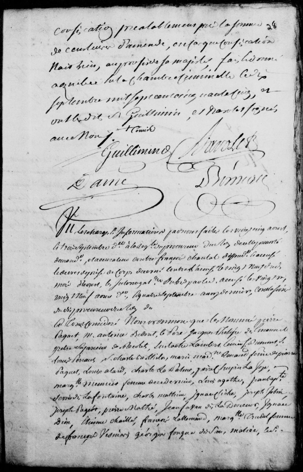 Procès de François Chantal, défendeur et accusé ; arrestation, interrogatoire, et ordonnance à l'effet que les nommés Pierre Paquet, maître Antoine Bedout père, Jacques Latulipe dit Emmanuel, prêtre supérieur des Récollets, Eustache Lambert, écuyer, sieur Dumont, le sieur Louis Perrault, le sieur Charles Berthelot, Marie-Madeleine Renaud, épouse de Pierre Paquet, Louise Allard, Charles Lapalme, Pierre Chupin Lajoie, Marguerite Meunier, épouse dudit Lajoie, Louis Agathe, Jean-Baptiste Guérin dit LaFontaine, Charles Mathieu, Ignace Cliche, Joseph Jobin, Joseph Pageot, Pierre Matte, Jean Martin dit LaDouceur, Ignace Dion, Étienne Chaillé, François Lallemand, Marguerite Trudel, épouse de François Vesman, Georges Fouque? dit Sansmalice, le sieur Jean Tachet (Taché), et François Vesman, tous témoins entendus en information, seront récolés et confrontés