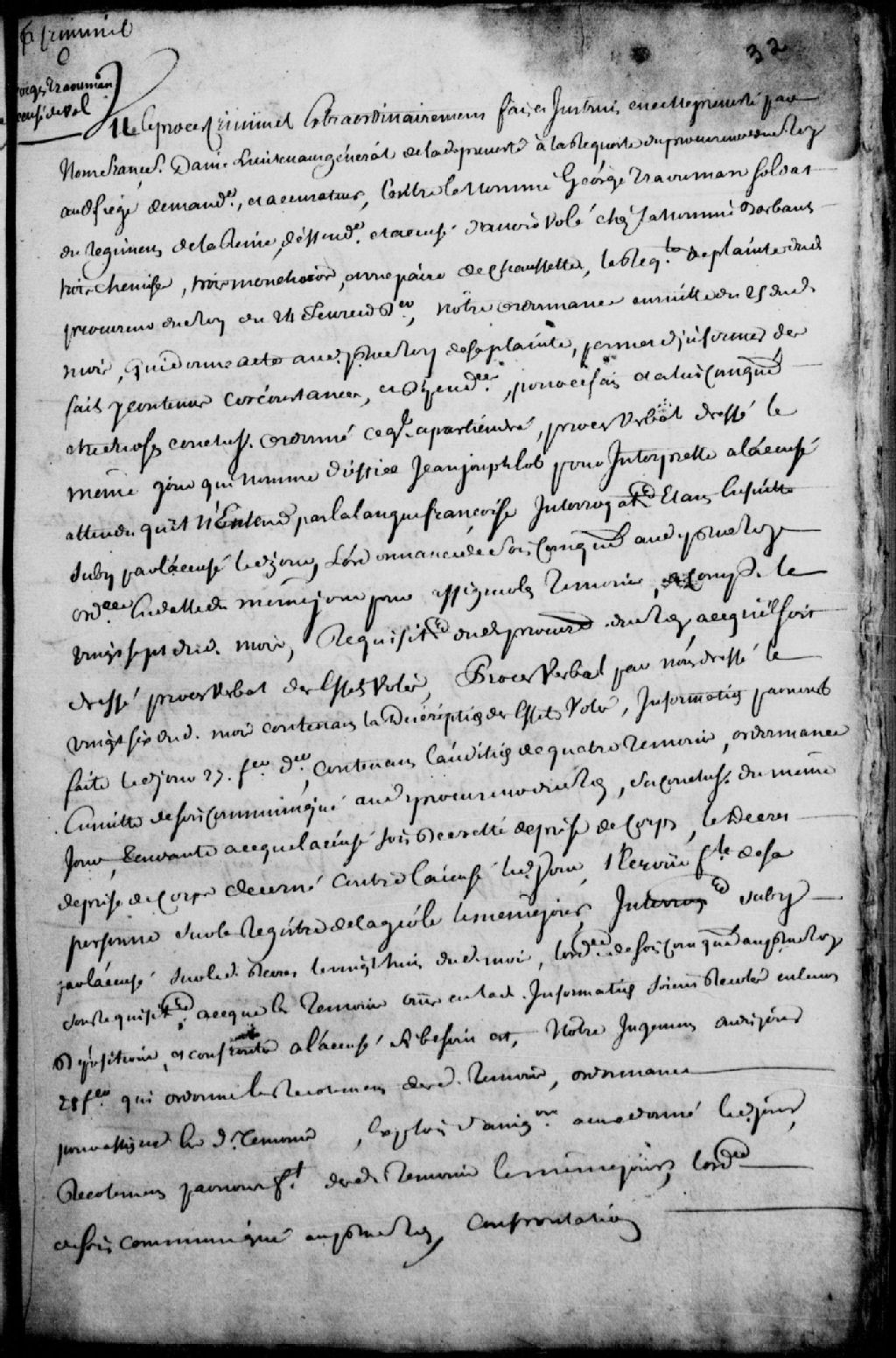 Procès de Georges Trahouman (Geörg Trauhman), soldat du régiment de la Reine, compagnie du Marron, défendeur, accusé d'avoir volé trois chemises, trois mouchoirs et une paire de chaussette chez la nommée Barbaut (Barbant - Barbeau), Jean-Joseph Lob est nommé comme interprète ; informations, interrogatoire, dépositions de quatre témoins, arrestation, récolements et confrontations, mention de Marie-Catherine Ouvray, épouse de Simon Brabant, Catherine Beaurang, épouse de Joseph LaFontaine et Catherine Buseteau fille, tous témoins, interrogatoire sur la sellette ; une sentence est prononcée et ledit accusé est déclaré coupable dudit vol, il est condamné à être battu nu et fustigé de verge, il sera marqué au fer chaud de la fleur de lys à l'épaule droite, il sera ensuite conduit aux galères du Roi pour y servir comme forçat pendant 3 ans