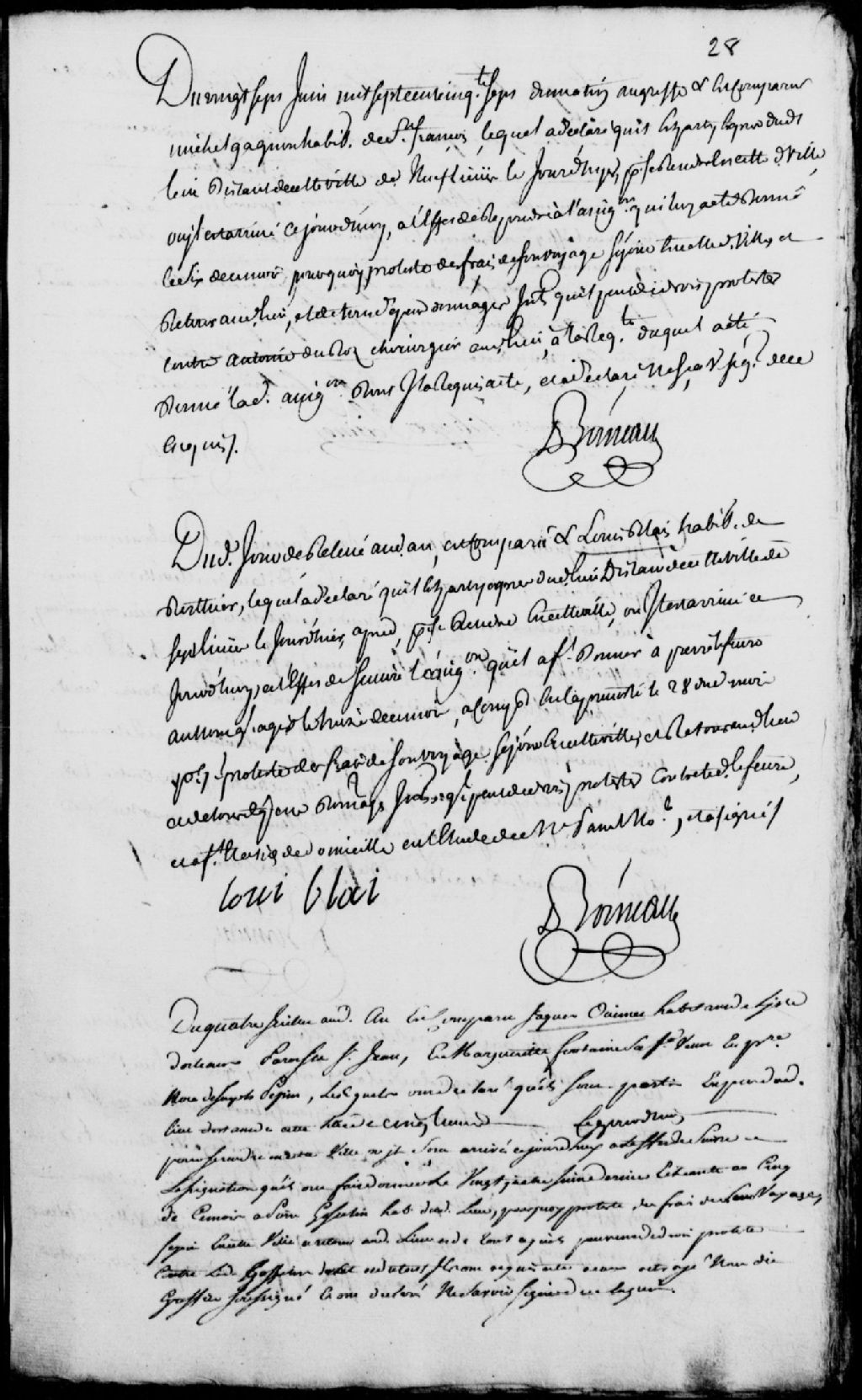 Comparution de Louis Blais, habitant de Berthier, lequel déclare être parti dudit lieu, d'une distance de 7 lieues, le 26 juin 1757 et être arrivé aujourd'hui, afin de suivre l'assignation qu'il a fait donner à Pierre Lefebvre (Lefèvre), il fait élection de domicile en l'étude de maître Panet, notaire, Signé Loui Blai