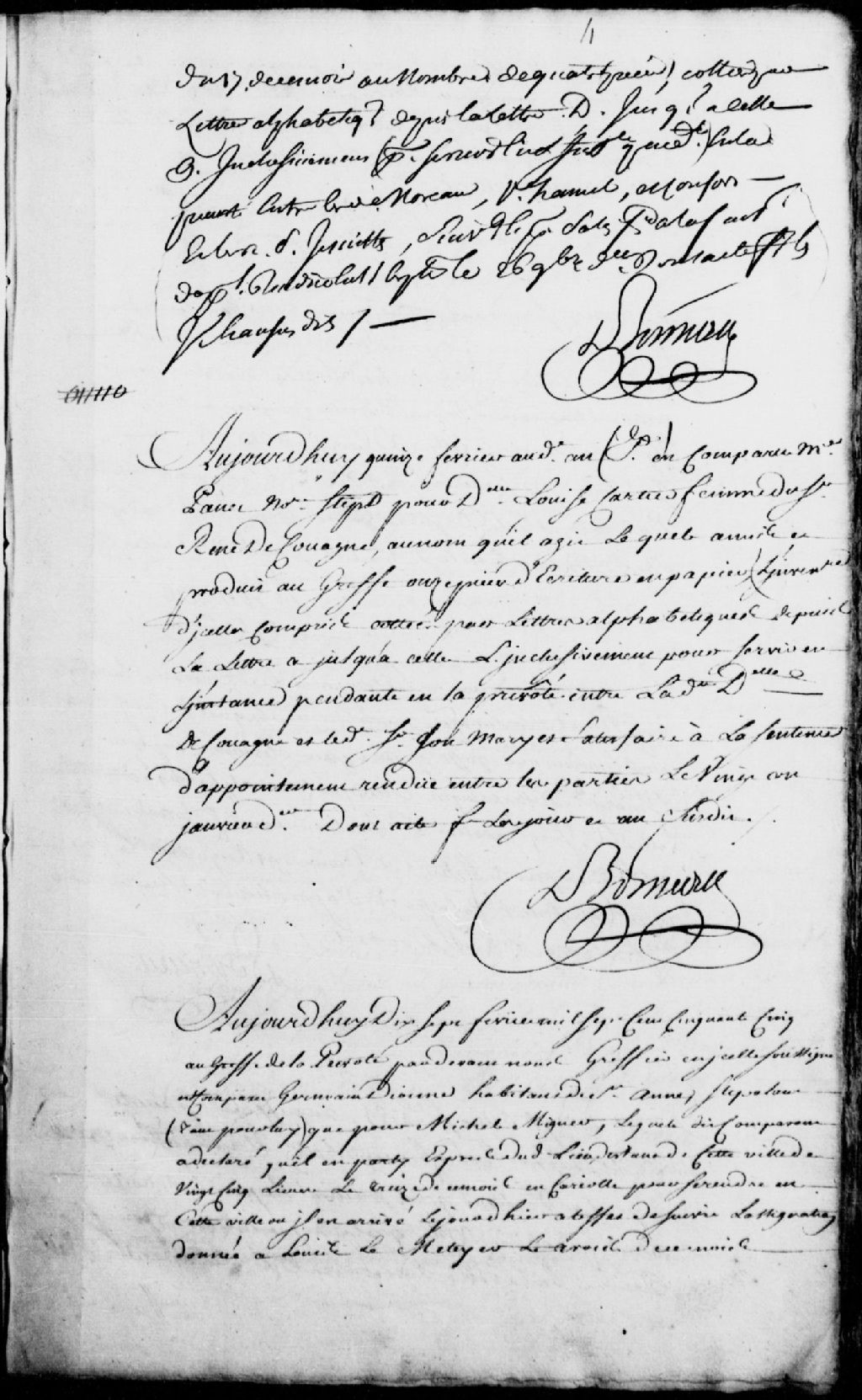 Comparution de Germain Dionne, habitant de Sainte-Anne, stipulant pour Michel Mignier, lequel déclare être parti dudit lieu en carriole, d'une distance de 25 lieues de Québec, le 13 février et être arrivé le 16 février 1755, selon l'assignation donnée à Louis LeMeteyer (Meteyer - Metayer) le 3 février 1755, à comparaître le 18 février 1755, signé Germain Dionne