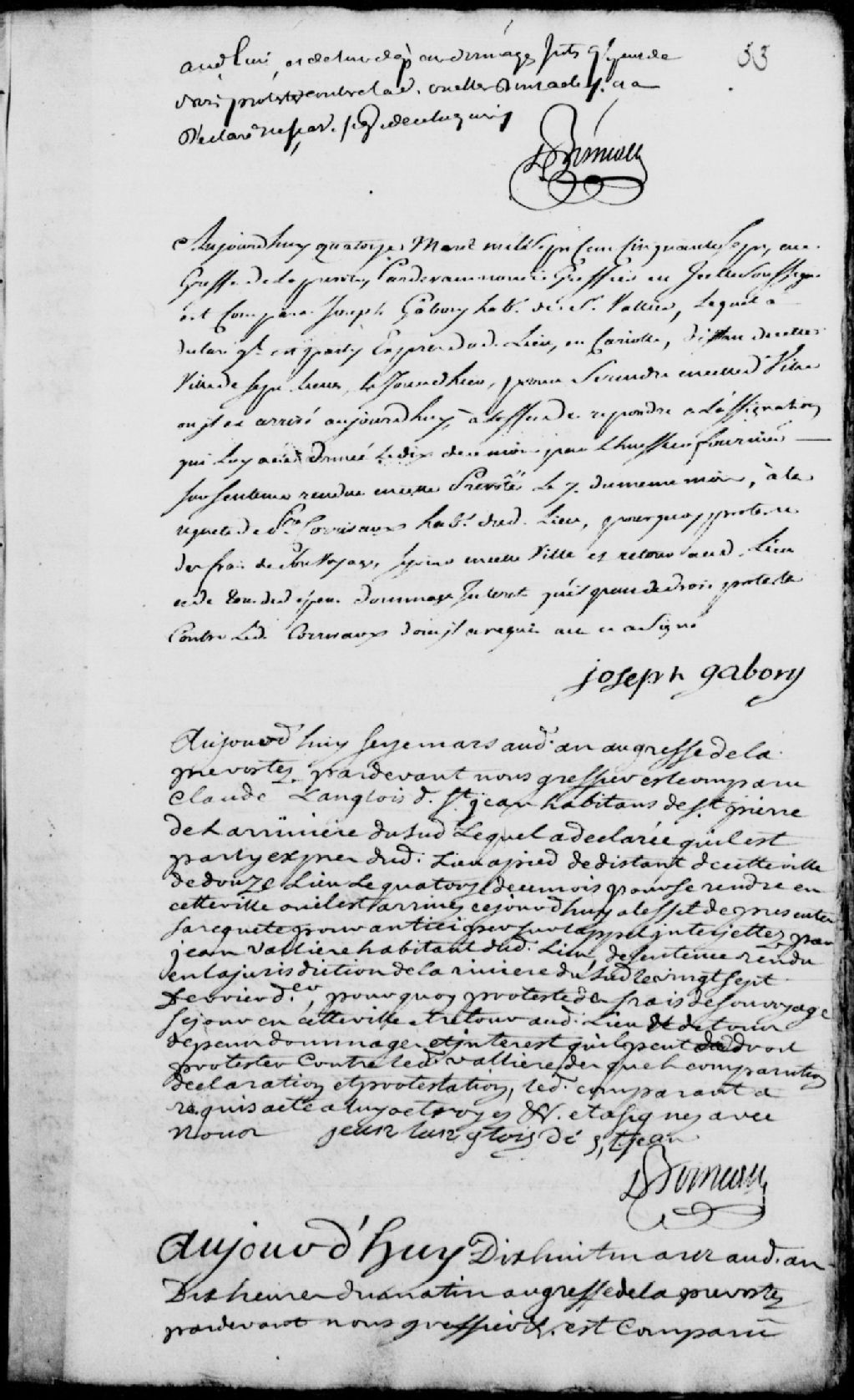 Comparution de Nicolas Charles Louis Lévesque (Lévêque), notaire, résidant de la Pointe-à-la-Caille à la Rivière du Sud, lequel déclare être parti dudit lieu en carriole, d'une distance de 11 lieues, le 16 mars 1758 et être arrivé aujourd'hui, afin de répondre à l'assignation qui lui a été donné le 13 mars 1758 sur l'ordre de monsieur le lieutenant général, à la requête de Mathurin Gagnon, habitant de Saint-François, Signé Lévesque