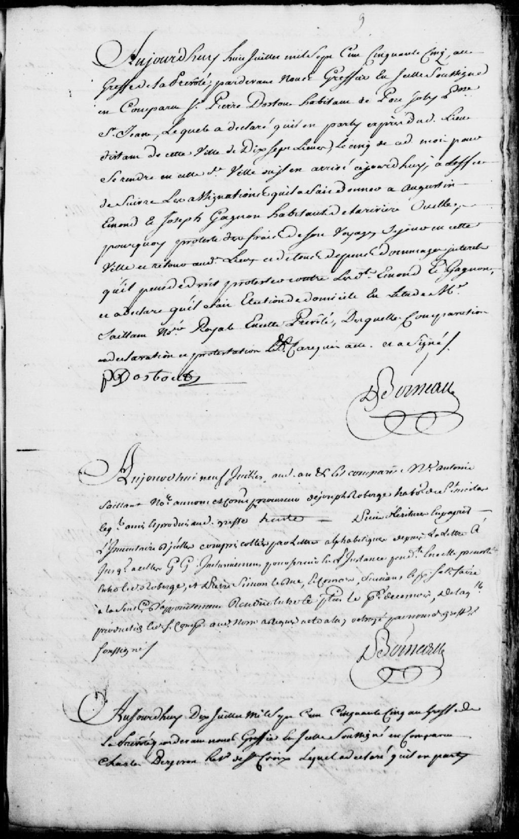 Comparution de Pierre Dostoux, habitant de Port Joly, en la paroisse Saint-Jean, lequel a déclaré être parti dudit lieu, d'une distance de 17 lieues, le 5 juillet 1755 et être arrivé aujourd'hui pour suivre les assignations qu'il a fait donner à Augustin Émond et Joseph Gagnon, habitants de la Rivière Ouelle, il fait élection de domicile en l'étude de maître Saillant, notaire royal, Signé P. Dostoux