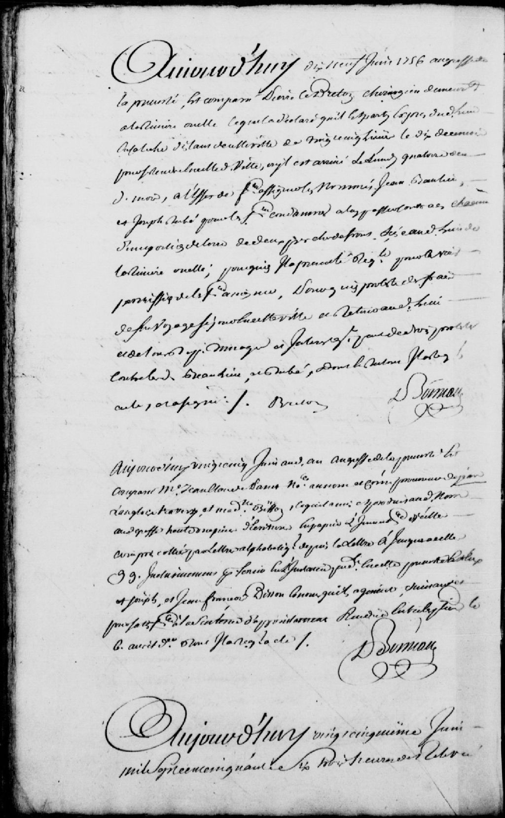 Comparution de Pierre Breton, chirurgien demeurant à la Rivière Ouelle, lequel déclare être parti dudit lieu en calèche, d'une distance de 25 lieues, le 10 juin 1756 et être arrivé le 14 juin 1756, afin de faire assigner les nommés Jean Beaulieu (Baulieu) et Joseph Dubé, pour les faire condamner à lui passer contrat d,une portion de terre chacun de deux perches de front sises aui lieu de la Rivière Ouelle, ledit Breton requiert la permission de les faire assigner, Signé Breton