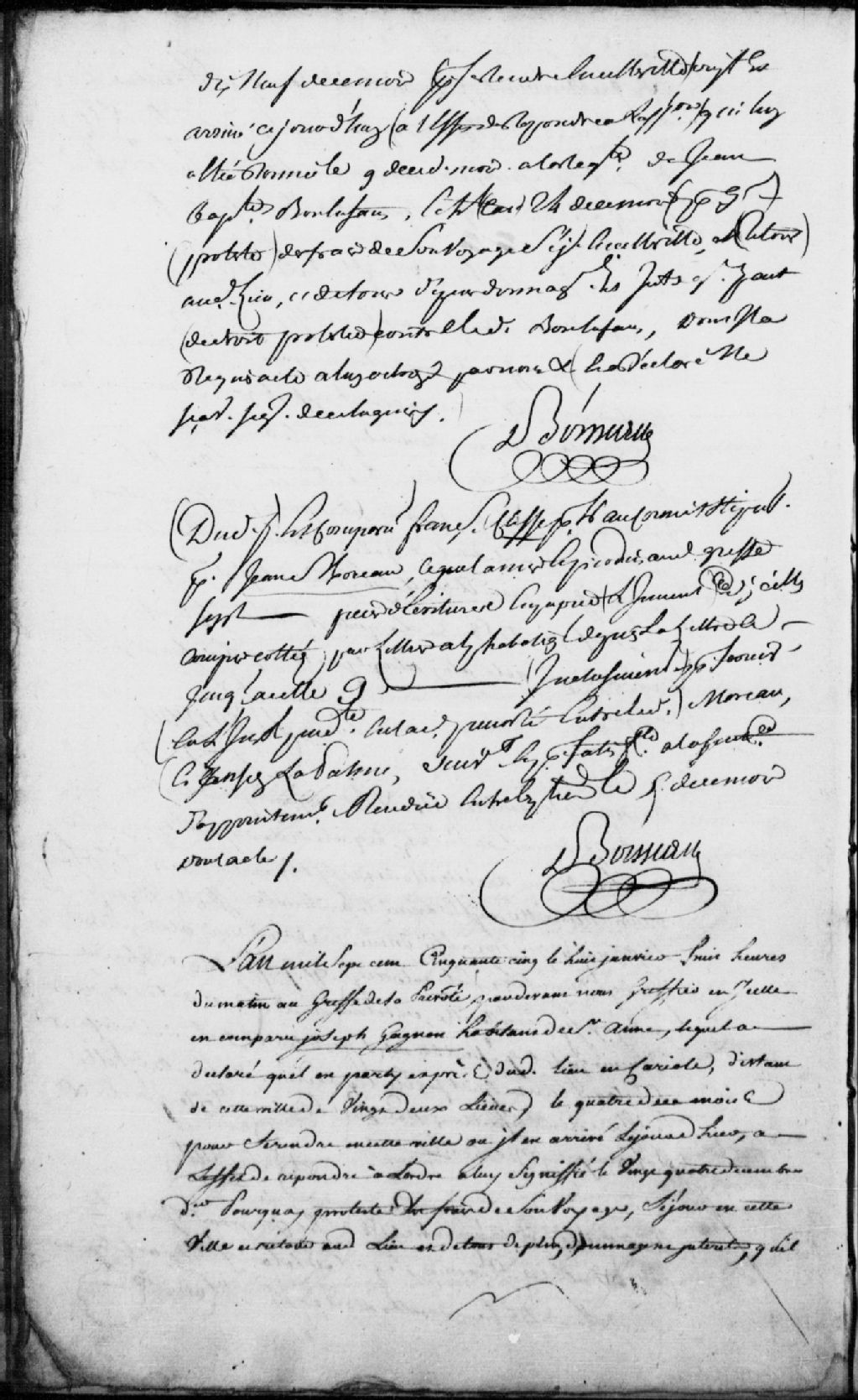 Comparution de Joseph Gagnon, habitant de Sainte-Anne, étant parti dudit lieu, d'une distance de 22 lieues, en carriole le 4 janvier 1755, et étant arrivé le 07 janvier 1755, il proteste des frais, dépens et intérêts dudit voyage et séjour contre les nommés Joseph Ouellet, Joseph Martin, Antoine Dionne et Jean Anctil, habitants de Sainte-Anne, syndics nommés pour la bâtisse et construction d'un presbythère à Sainte-Anne (Signé Joseph Gagnon)
