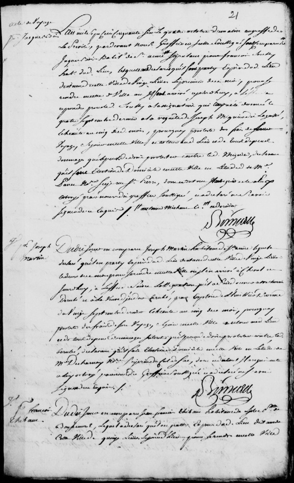 Comparution de François Thibault, habitant de l'Islet, en la paroisse de Bonsecours, lequel déclare être parti dudit lieu, d'une distance de 15 lieues, le 13 octobre 1756 et être arrivé aujourd'hui, afin de répondre à l'assignation qui lui a été donnée le 25 septembre 1756 à la requête de François Jeannot, il fait élection de domicile en l'étude de maître Decharnay, notaire, sis rue du Cul-de-Sac, il déclare ne savoir signer