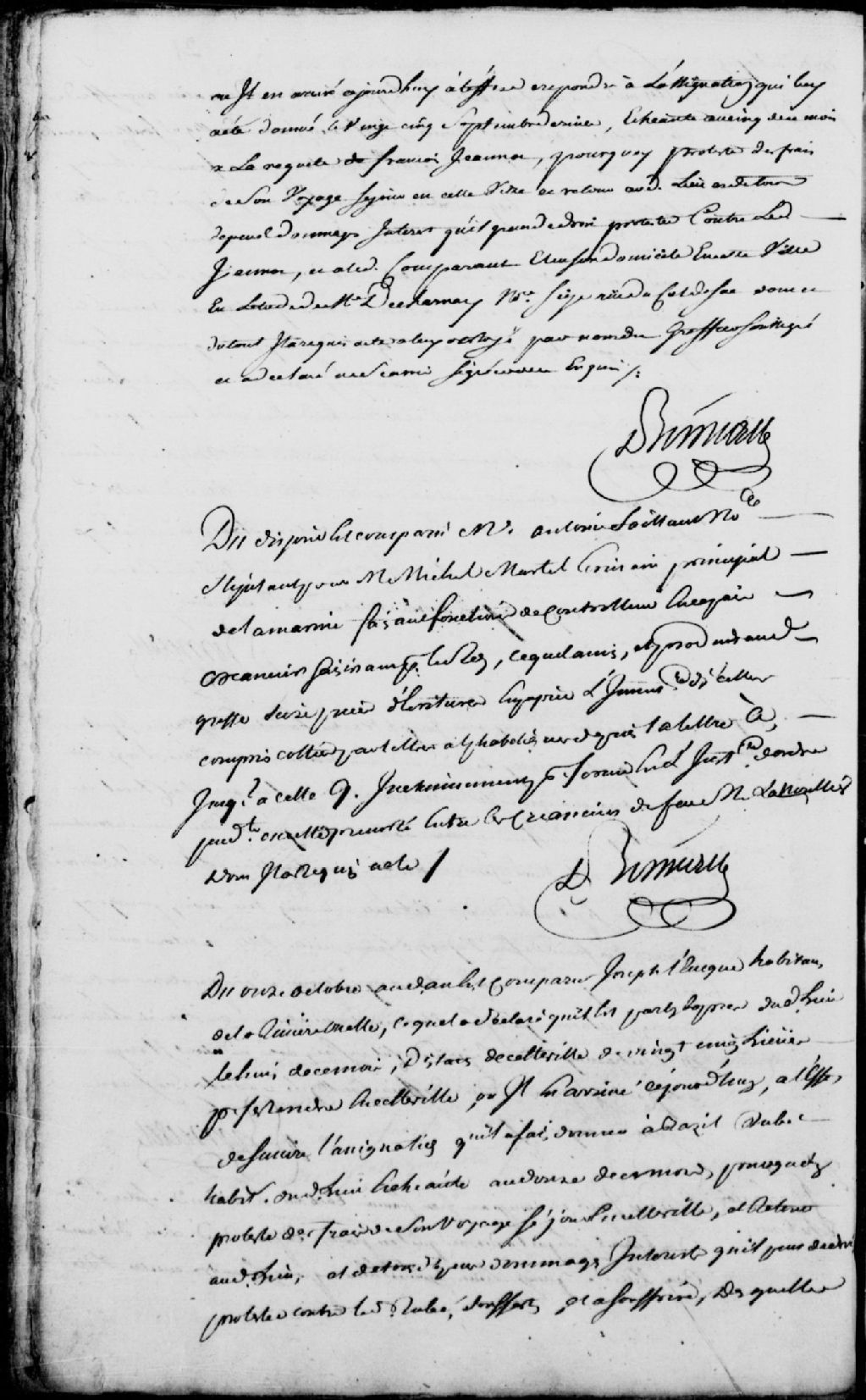 Comparution de maître Antoine Saillant, notaire, stipulant pour Michel Martel, écrivain principal de la Marine, faisant fonction de controleur en Nouvelle-France, créancier faisant pour le roi, lequel produit 16 pièces d'écriture en papier et leur inventaire, pour servir l'instance d'ordre entre les créanciers du feu sieur Lanoullier (Lanouiller)