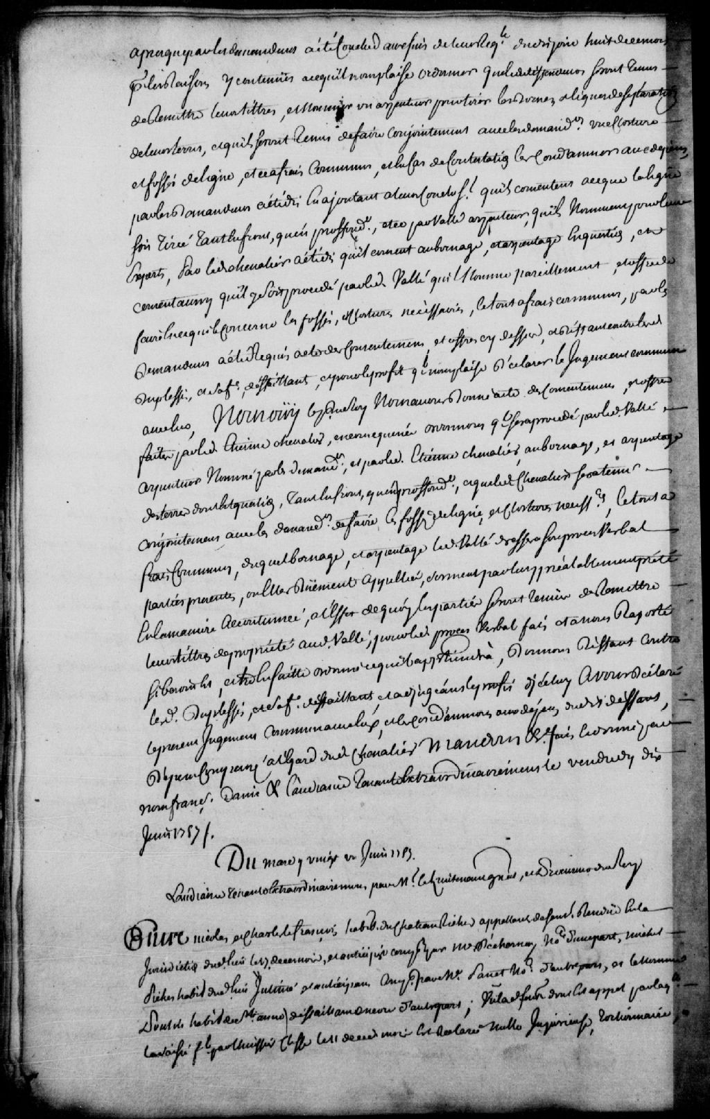 Cause entre Nicolas LeFrançois et Charles LeFrançois, habitants du Château-Richer, reçus appelants de la sentence rendue en la Juridiction du Château-Richer le 17 juin 1757, comparant par maître Decharnay, notaire, et Michel Picher (Piché -Pichet), intimé, comparant par maître Panet, notaire ; mention du nommé Poulin, habitant de Sainte-Anne, défaillant ; les appelants ayant été condamnés à 500 livres de dommages et intérêts, lesquels sont réduits à la somme de 150 livres, et les appelants sont condamnés à 40 sols pour leur fol appel et aux dépens liquidés à 9 livres et 15 sols
