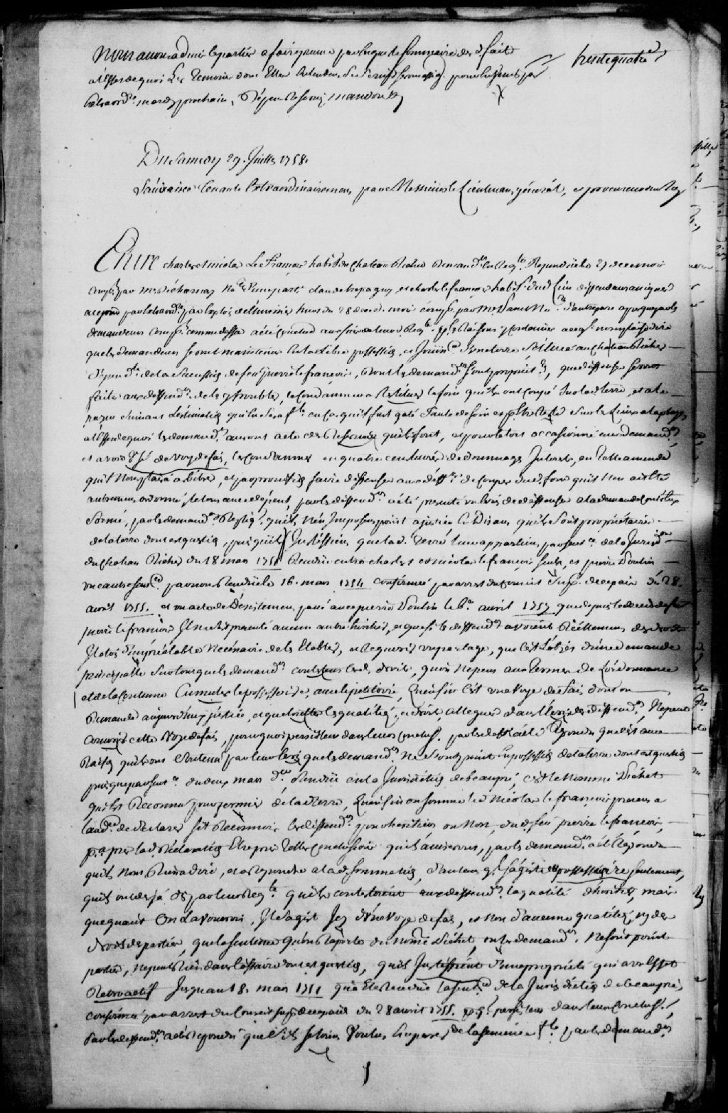 Cause entre Charles LeFrançois et Nicolas LeFrançois, habitants du Château-Richer, demandeurs, comparant par maître Decharnay, et Claude Trépagny (Trépanier) et Charles LeFrançois, habitants du Château-Richer, défendeurs, comparant par maître Panet, notaire, à propos d'une terre sise au Château-Richer dépendante de la succession du feu Pierre LeFrançois dont les demandeurs sont propriétaires ; mention de foin coupé sur ladite terre, laquelle terre appartenant aux demandeurs par sentence rendue en la Juridiction du Château-Richer le 18 mars 1751 ; mention d'une autre sentence rendue le 16 mars 1754 et confirmée le 28 avril 1755 ; mention d'un acte passé avec le nommé Pierre Poulin le 6 avril 1757 ; il est ordonné que les demandeurs demeureront en la possession de la terre en question, les défendeurs ont défense de les troubler et sont condamnés à restituer le foin en question ou à le payer selon une estimation faite par un expert, les défendeurs sont condamnés aux dépens liquidés à 24 livres, 29 juillet 1758, Archives nationales à Québec, Fonds Prévôté de Québec, (03Q,TL1,S11,SS1,D106,P77).