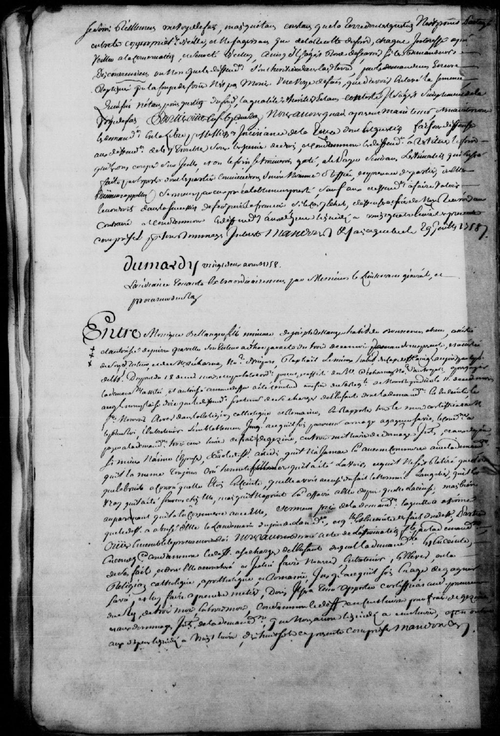 Cause entre Monique Bélanger, fille mineure de Joseph Bélanger, habitant de Bonsecours, absent, assistée et autorisée de Pierre Gravel, son tuteur ad hoc par acte du 3 août 1758, demanderesse, assistée de son tuteur et de maître Decharnay, notaire, et Raphaël Lemieux, habitant du Cap, défendeur, assisté de maître Decharnay, notaire ; le défendeur est condamné à se charger de l'enfant dont la demanderesse est enceinte, il devra le nourrir, l'entretenir et l'élever en la religion catholique, apostolique et romaine jusqu'à ce qu'il soit en âge de gagner sa vie, et de lui apprendre un métier dont il sera tenu de rapporter un certificat au procureur du roi, ledit défendeur est condamné à 100 livres pour le temps de gésine (accouchement) et dommages, et aux dépens liquidés à 20 livres et 18 sols