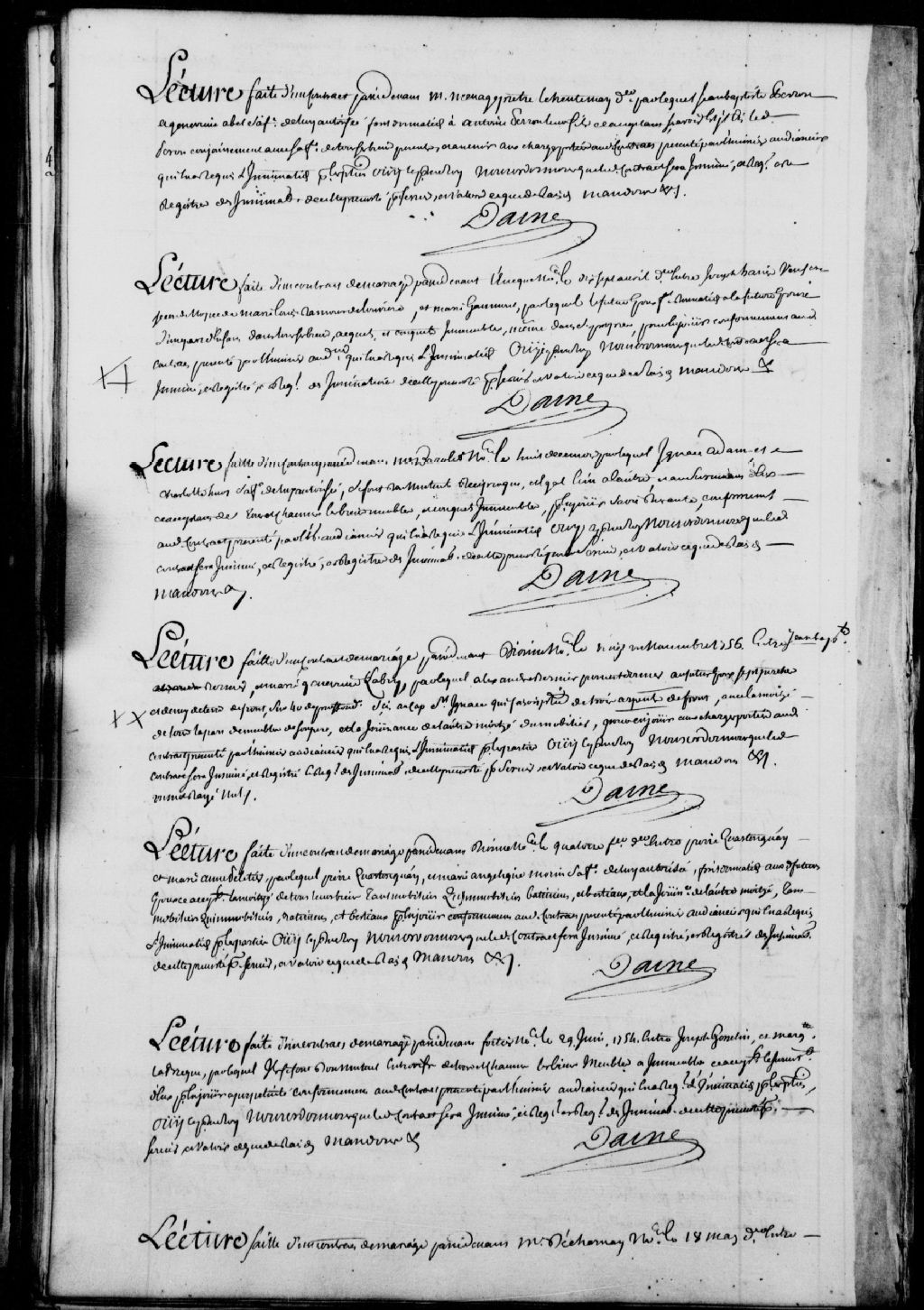 Lecture d'un contrat passé par-devant Ménage, prêtre, le 30 mai 1757, par lequel Jean-Baptiste Perron et Geneviève Abel, sa femme, font don à Antoine Perron, leur fils, de tous leurs biens, il est ordonné que ledit contrat soit insinué au registre des insinuations