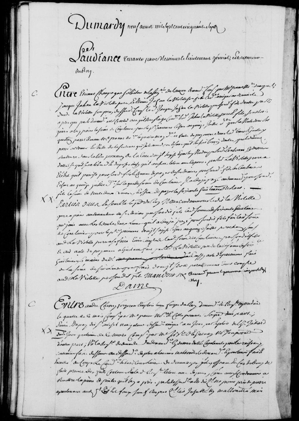 Cause entre André Chevery, forgeron employé aux forges du Roi, demandeur, comparant par maître Panet, notaire; et Pierre Dupuy (Dupuis) dit Saint-Michel, navigateur, défendeur, comparant par maître Jean-Baptiste Decharnay, notaire, ledit demandeur déclare que ledit défendeur l'a maltraité et frappé, réclamant la somme de 300 livres en dommages et que ledit Saint-Michel lui remette la pierre de poêle qu'il lui a prise alors le défendeur réplique qu'il n'a point pris la pierre dudit demandeur et qu'il est faux de dire qu'il l'a insulté ou maltraité, il est ordonné que des témoins seront assignés et entendus avant de faire droit aux parties, dépens réservés, 9 août 1757, Archives nationales à Québec, Fonds Prévôté de Québec, (03Q,TL1,S11,SS1,D107,P1092).