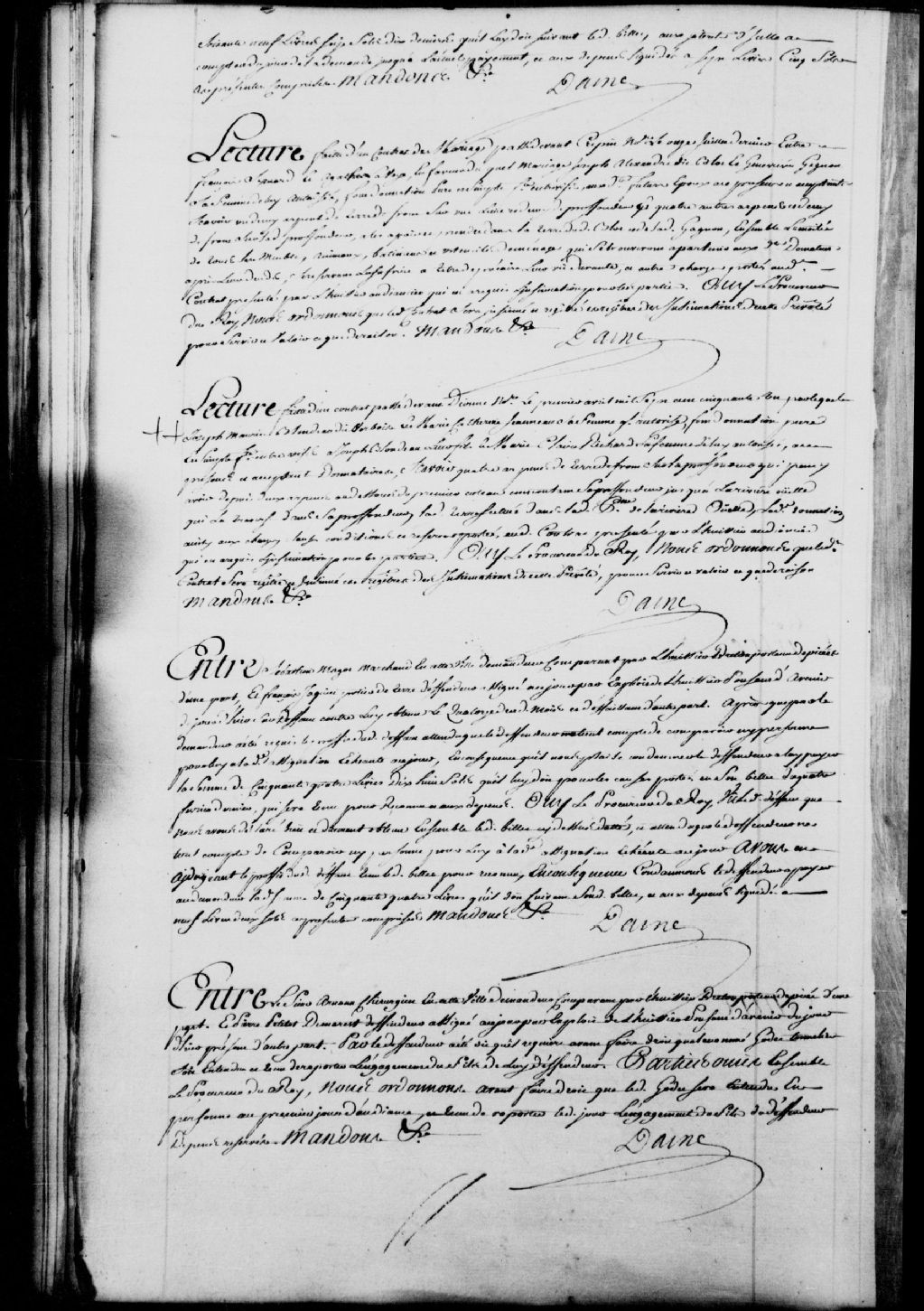 Lecture d'un contrat passé par-devant Dionne, notaire, le 1er avril 1751, par lequel Joseph-Maurice Blondeau dit Verbois et Marie-Catherine Janneau (Janot), sa femme, font don à Joseph Blondeau, leur fils, et Marie-Claire Richard, sa femme, de quatre arpents de terre de front sur la profondeur qu'il peut y avoir depuis deux arpents au-dessous du premier coteau, en comptant la profondeur jusqu'à la rivière Ouelle, ladite terre située dans la paroisse de la Rivière-Ouelle, il est ordonné que ledit contrat soit insinué au registre des insinuations